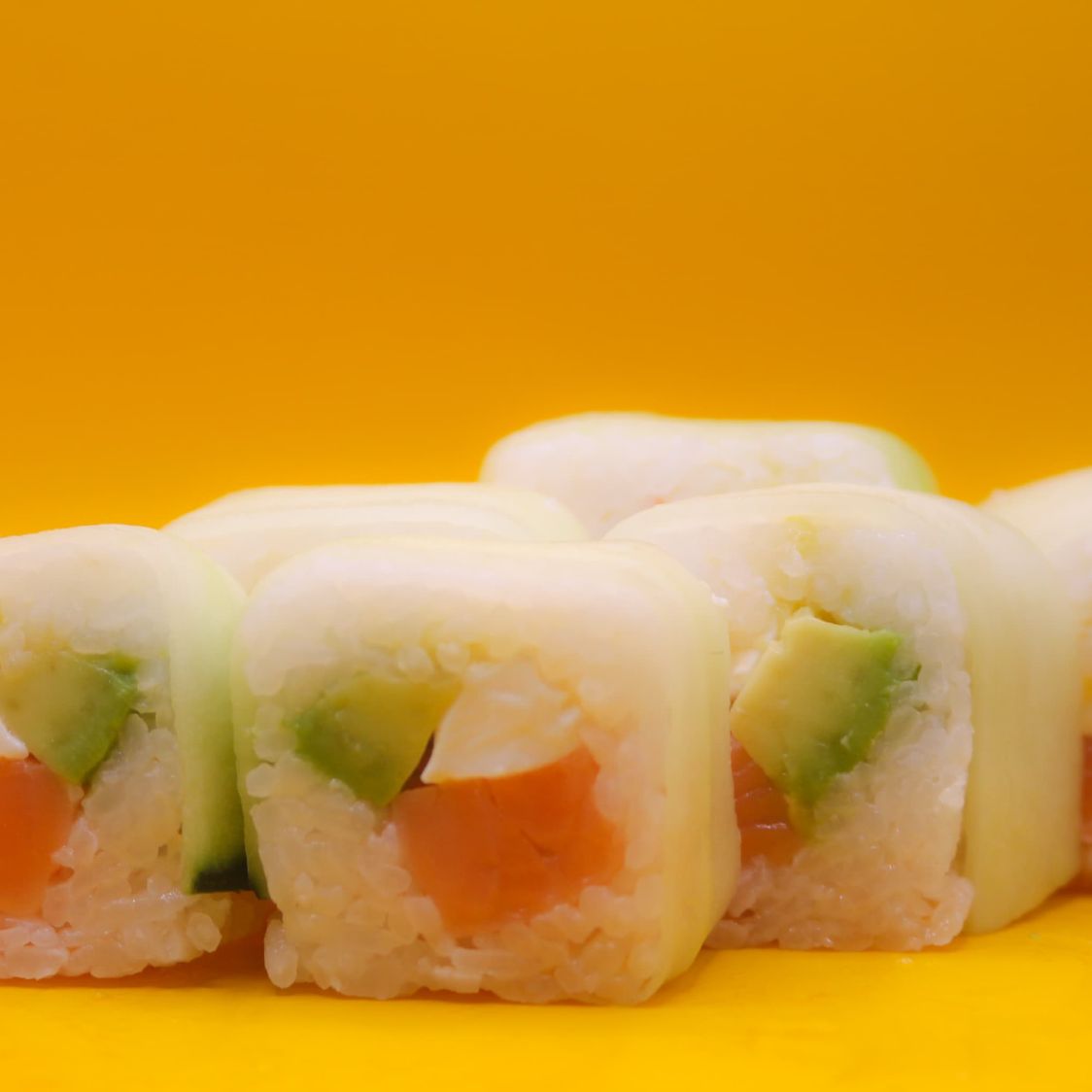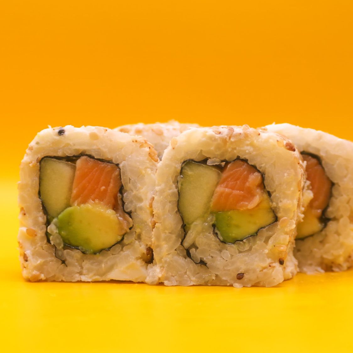 Salmón, Aguacate, Pepino, envuelto en queso y Ajonjolí.