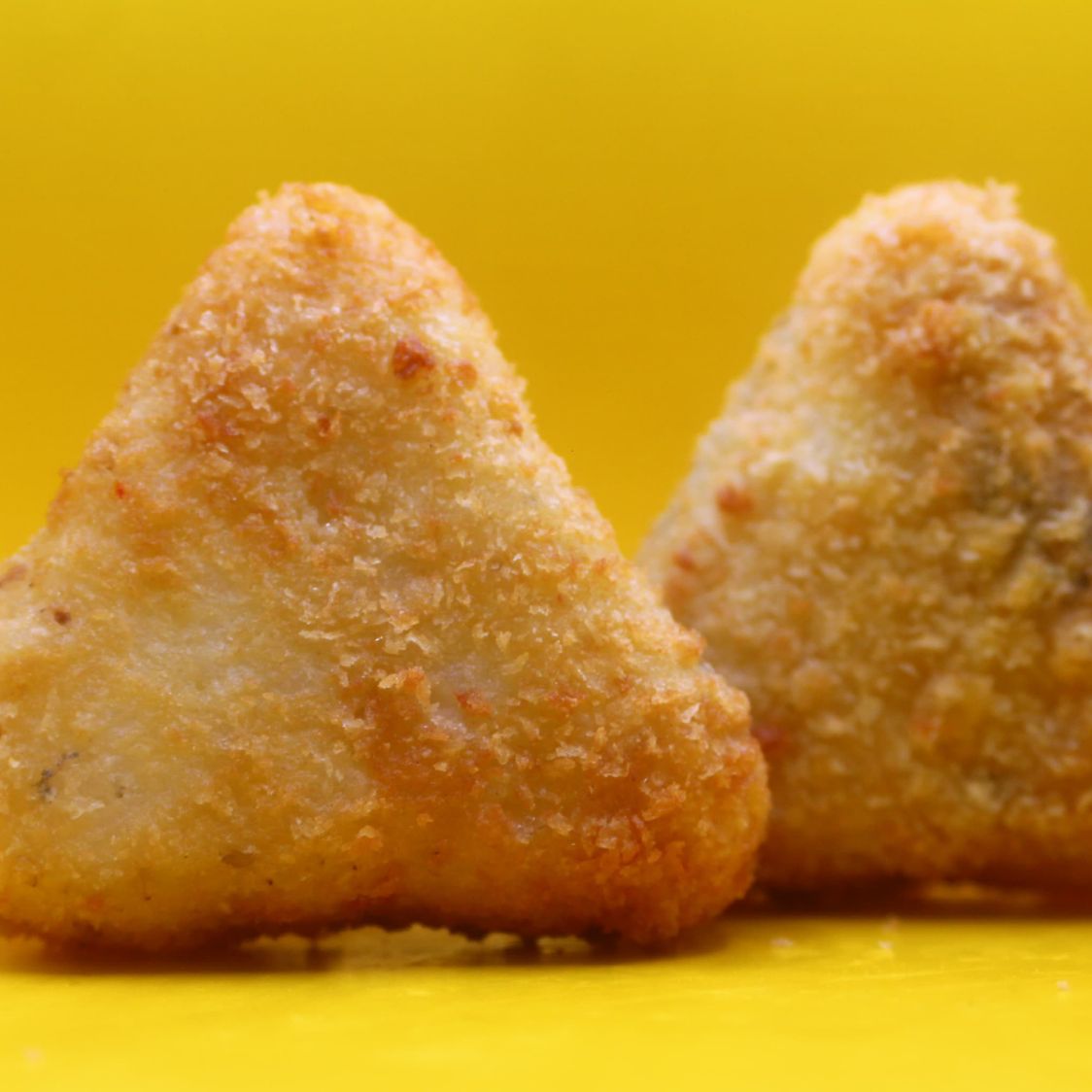 2 triangulos de arroz sushi,rellenos de tampico o queso crema, Salsa de Soya.