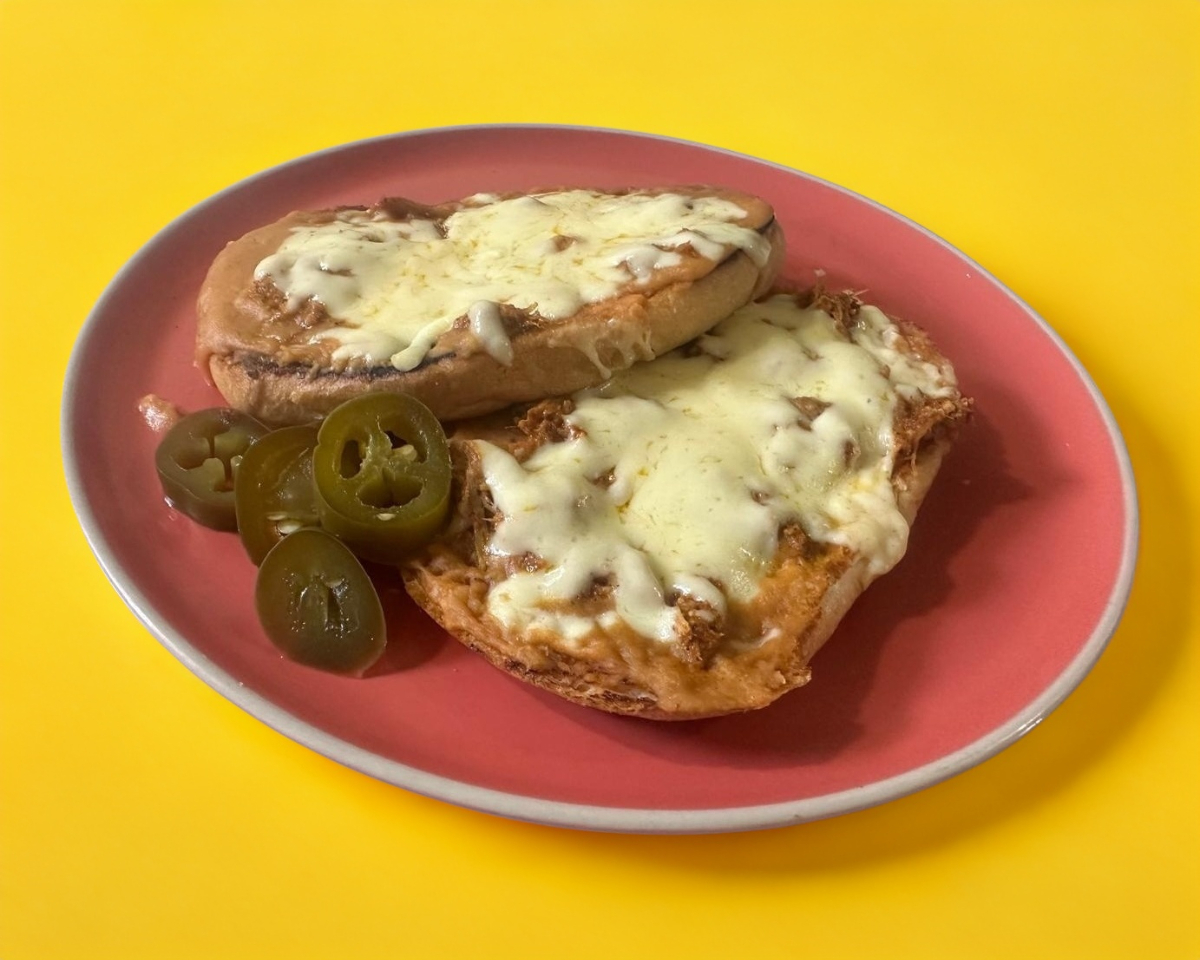 2 Mitades de pan dorado al comal, frijol puerco, cochinita y gratinado con queso tipo chester.