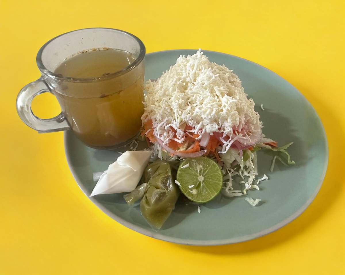 Unidad riquísima gordita casera frita preparada a base frijol, carne, lechuga, zanahoria, cebollita curtida y queso rallado. Incluye: vaso de consomé, crema, salsita y limón.
