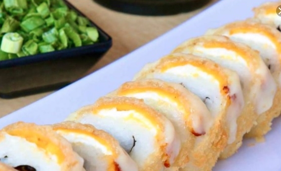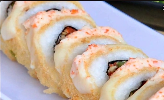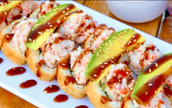 Rollo empanizado horneado de res, Philadelphia y pepino. Gratinado con res frita, cebolla asada cubos de aguacate bañado en aderezo especial