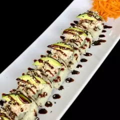 P.D- Cangrejo. P.F- Forrado de Aguacate. Topping de Tampico, Camarones Empanizados. Bañado en salsa de anguila, Puntos de sriracha y ajonjolí. Acompañado de aderezo cilantro.