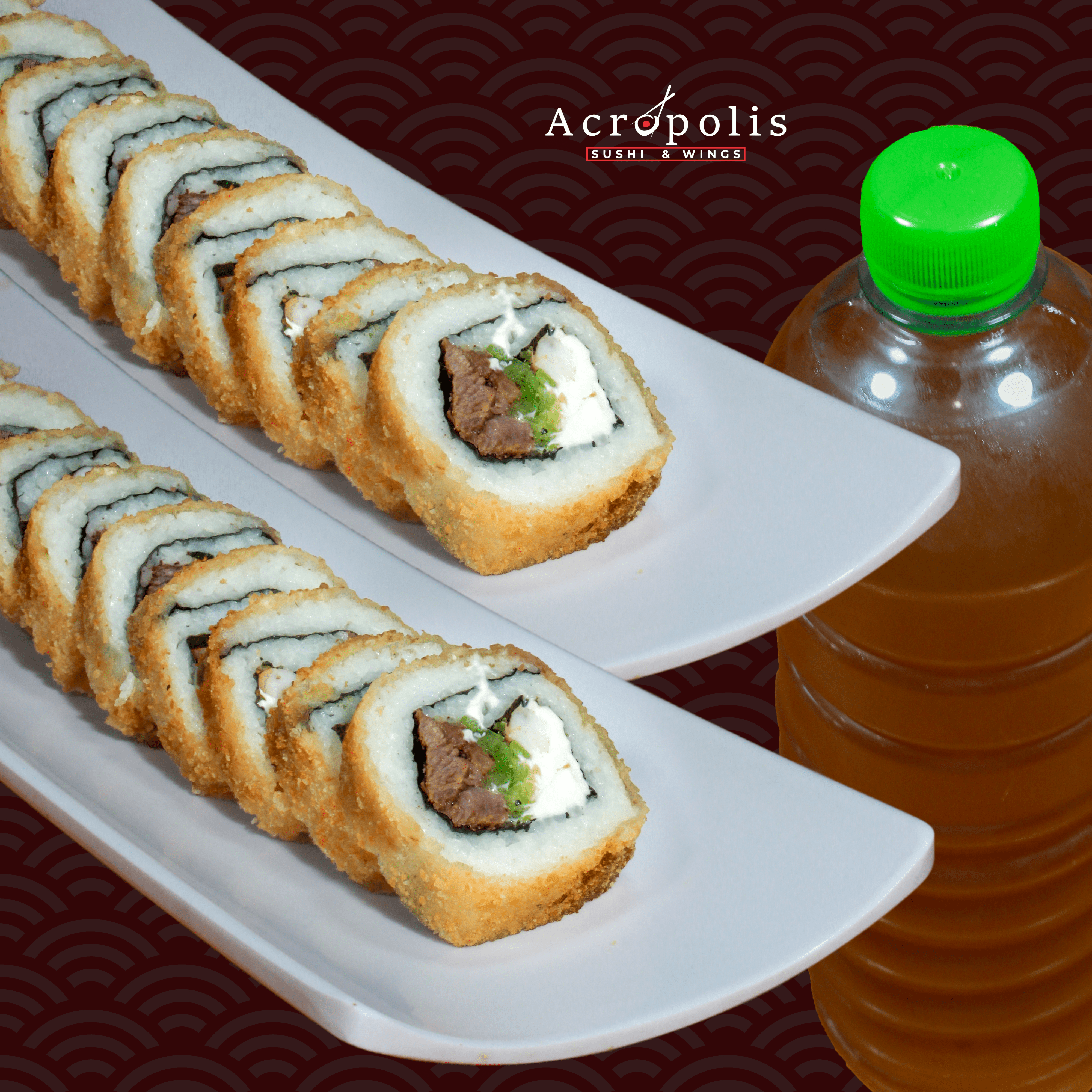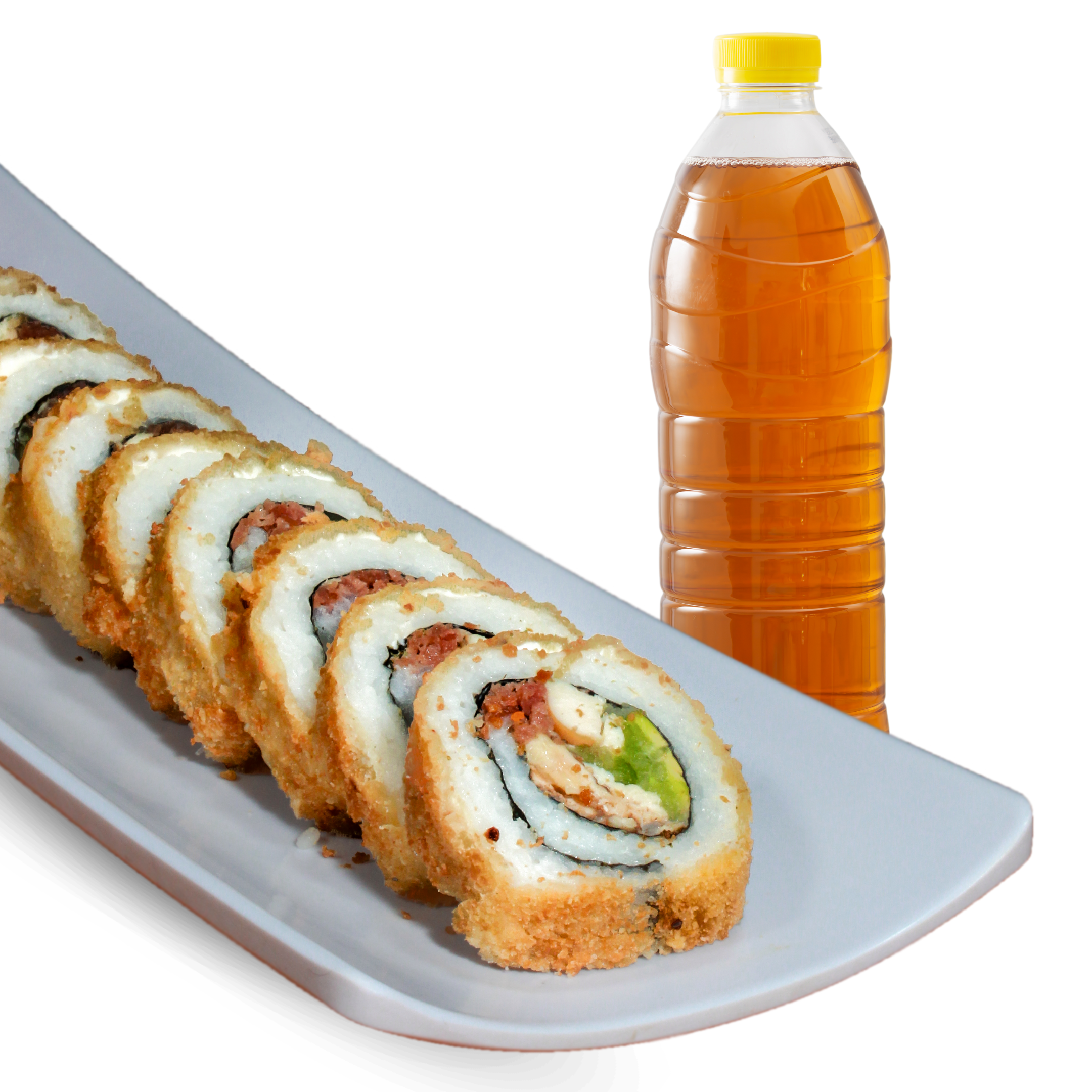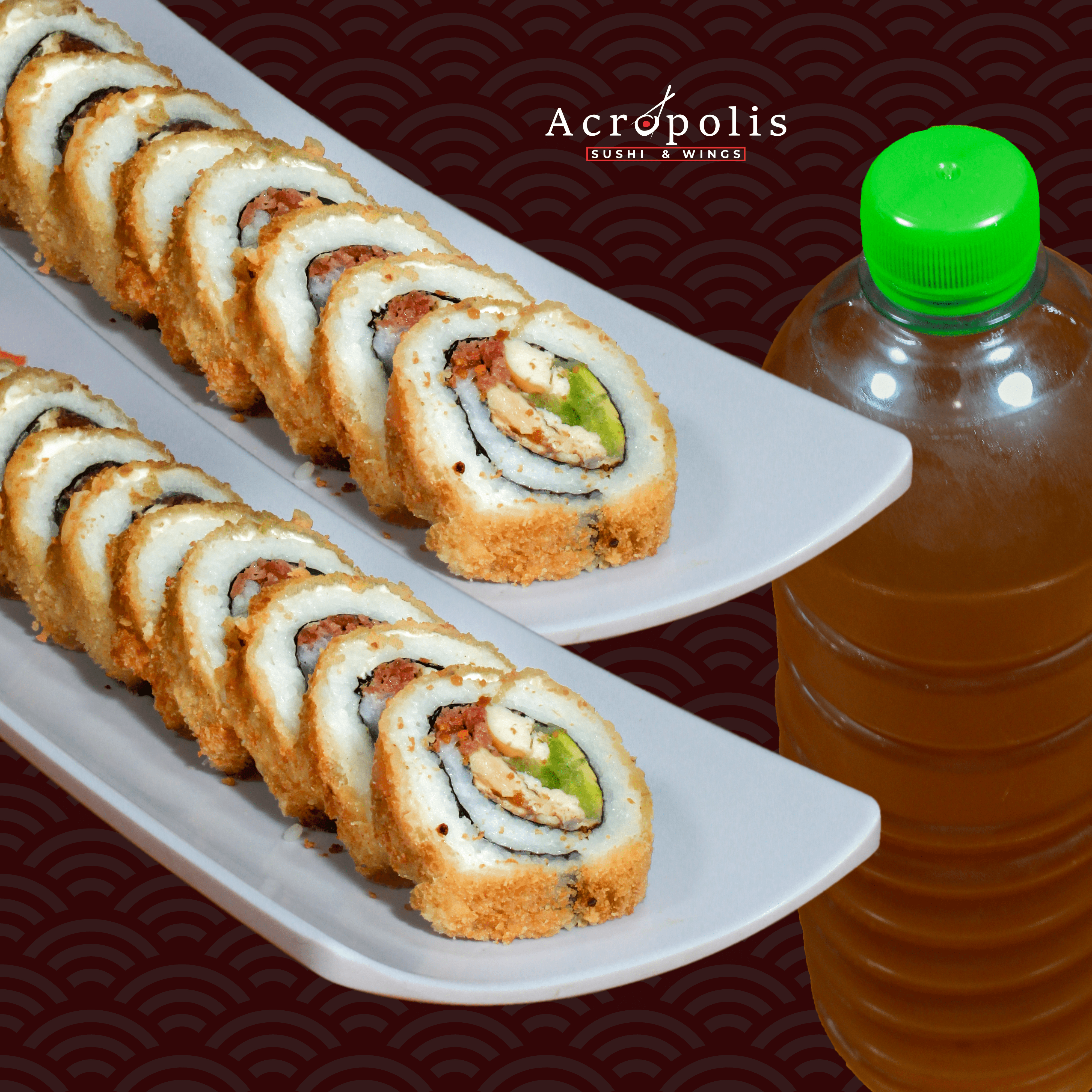 P.D- Camarón Empanizado. P.F- Philadelphia, Camarón y Aguacate. Topping de Tampico. Acompañado de Aderezo Cilantro.
