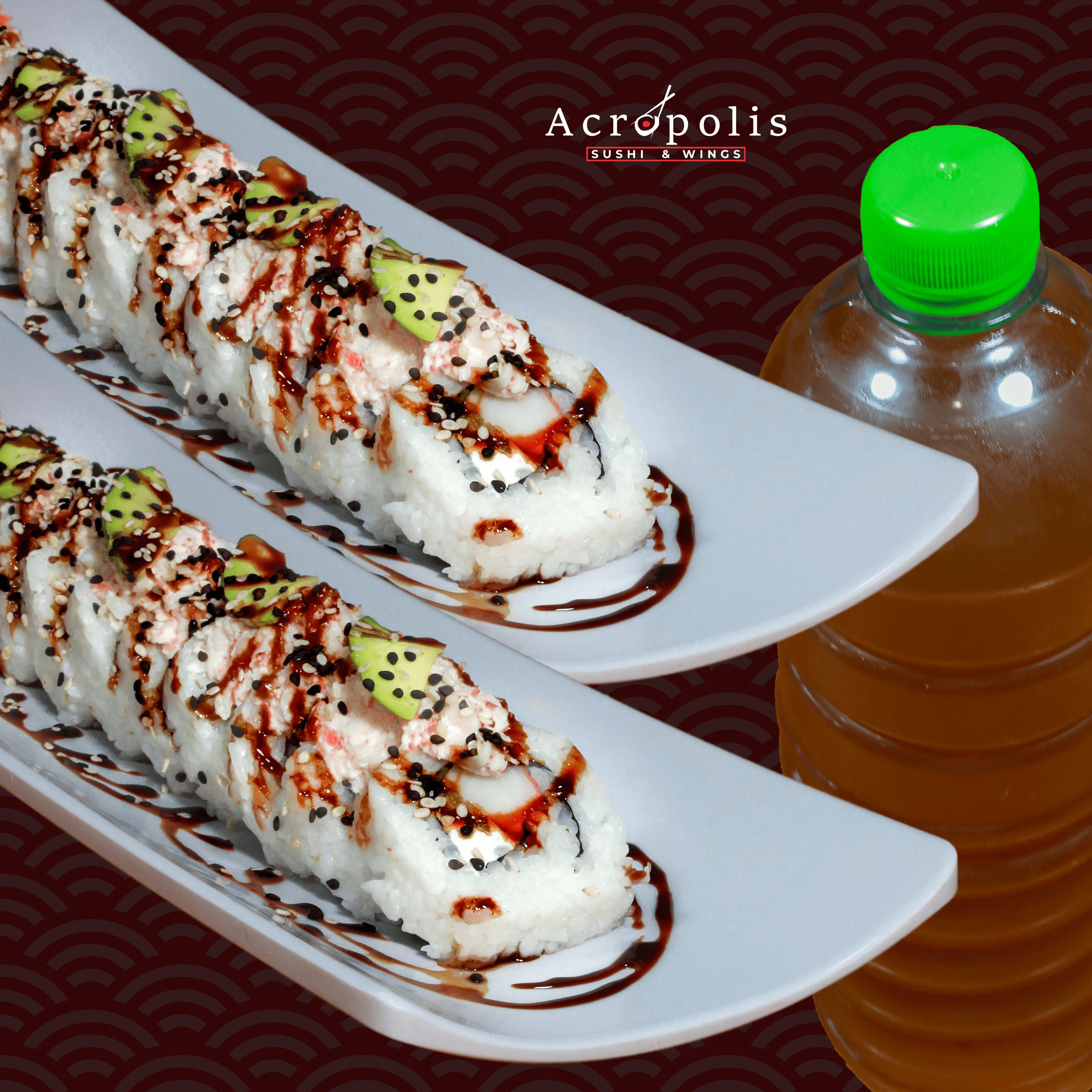 P.D- Camarón. Topping de tampico y rajitas de aguacate, bañado en salsa de anguila y ajonjolí. Acompañado de aderezo cilantro.