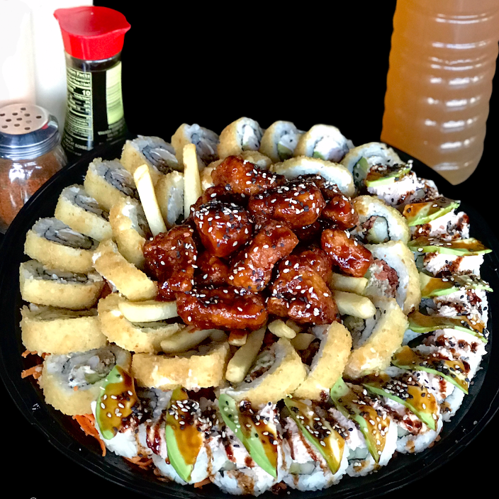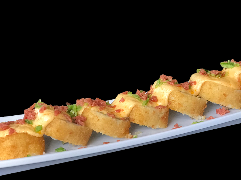 P.D- Camarón. P.F. Queso gratinado con aderezo especial. Topping de cebollita, chile caribe y res teriyaki. Empanizado horneado.
