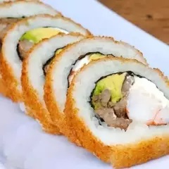 P.D- Philadelphia, pepino, aguacate pollo y Tocino Topping de philadelphia, queso chihuahua y aderezo volcano con res y chile serrano. Empanizado horneado.