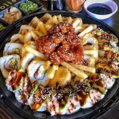 Arroz mezclado con tampico, Philadelphia, queso chihuahua, res y pollo. Topping de salsa anguila.
