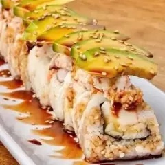 P.D Camarón. P.F- Forrado de aguacate. Topping de kanikama, y camarones empanizados, bañado en salsa de anguila, puntitos de sriracha y ajonjolí. Acompañado de aderezo cilantro.
