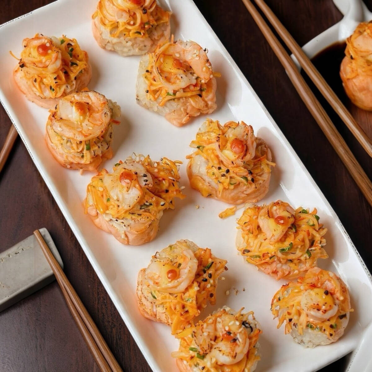 P.D- Philadelphia, pepino, aguacate y res Topping gratinado de aderezo volcánico con camarones fritos enteros en el gratinado. Empanizado horneado.