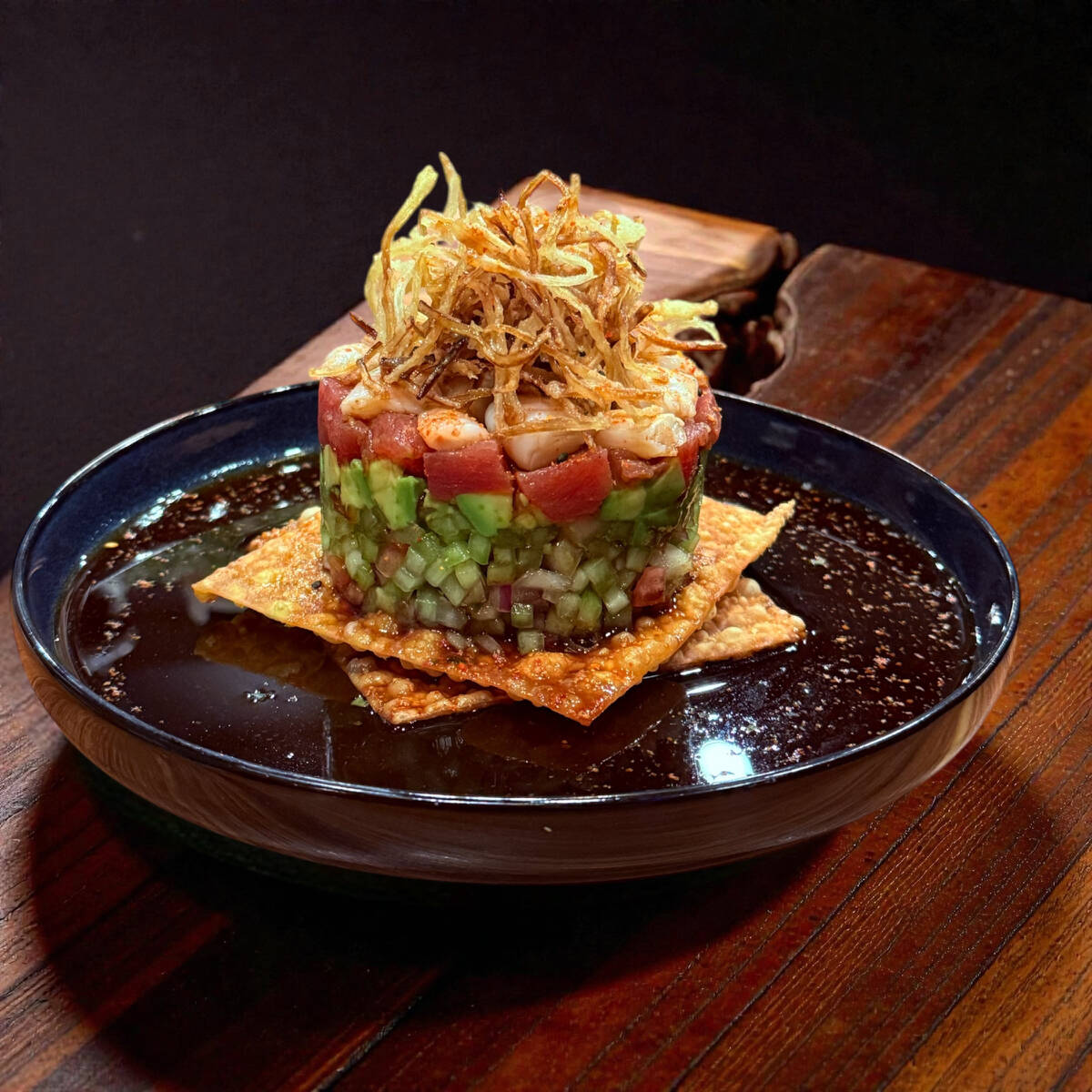 -Aguacate y atún fresco en cubitos. -Servido hasta tu mesa con nuestra salsa de aguachile y un toque de nuestro mix marisquero.