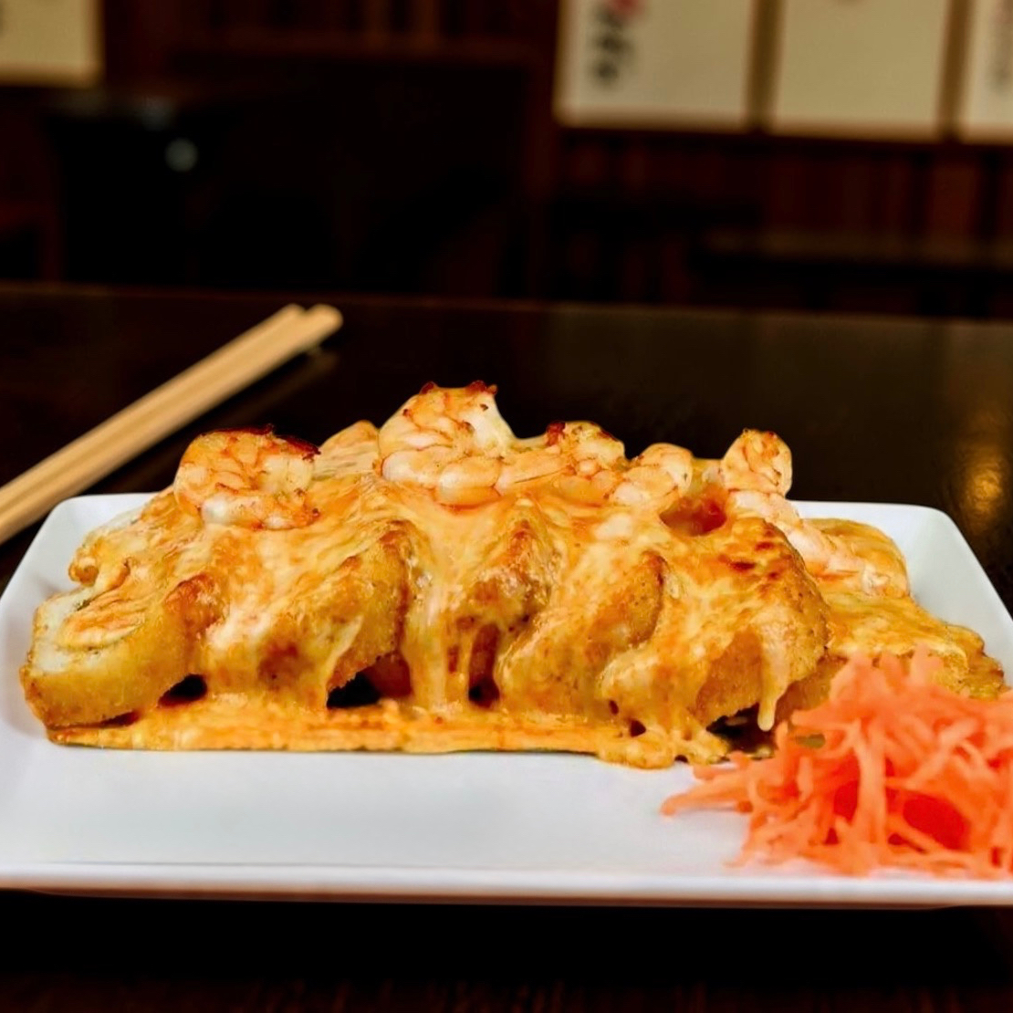 P.D- Res, pollo y camarón P.F Queso chihuahua con tampico, bañado en aderezo especial y salsa de anguila coronado con rueditas de chile serrano. Empanizado horneado.
