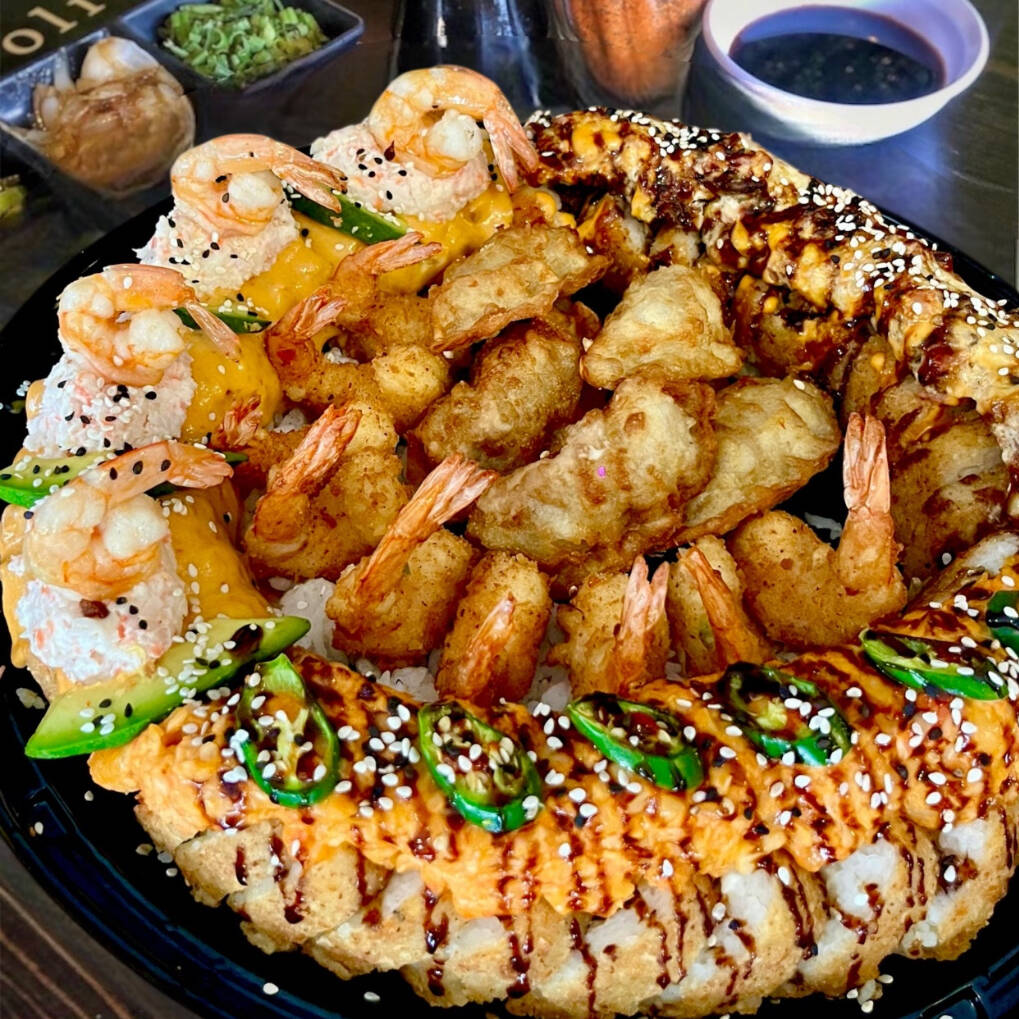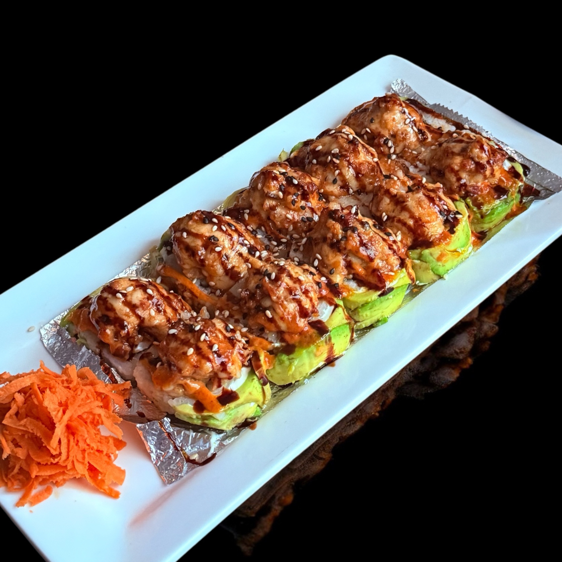 Chile caribe capeado, relleno de Philadelphia, queso chihuahua, tampico spicy, res, pollo y camarón. Topping rajitas de aguacate, salsa de anguila y ajonjolí. Acompañada de arroz blanco.