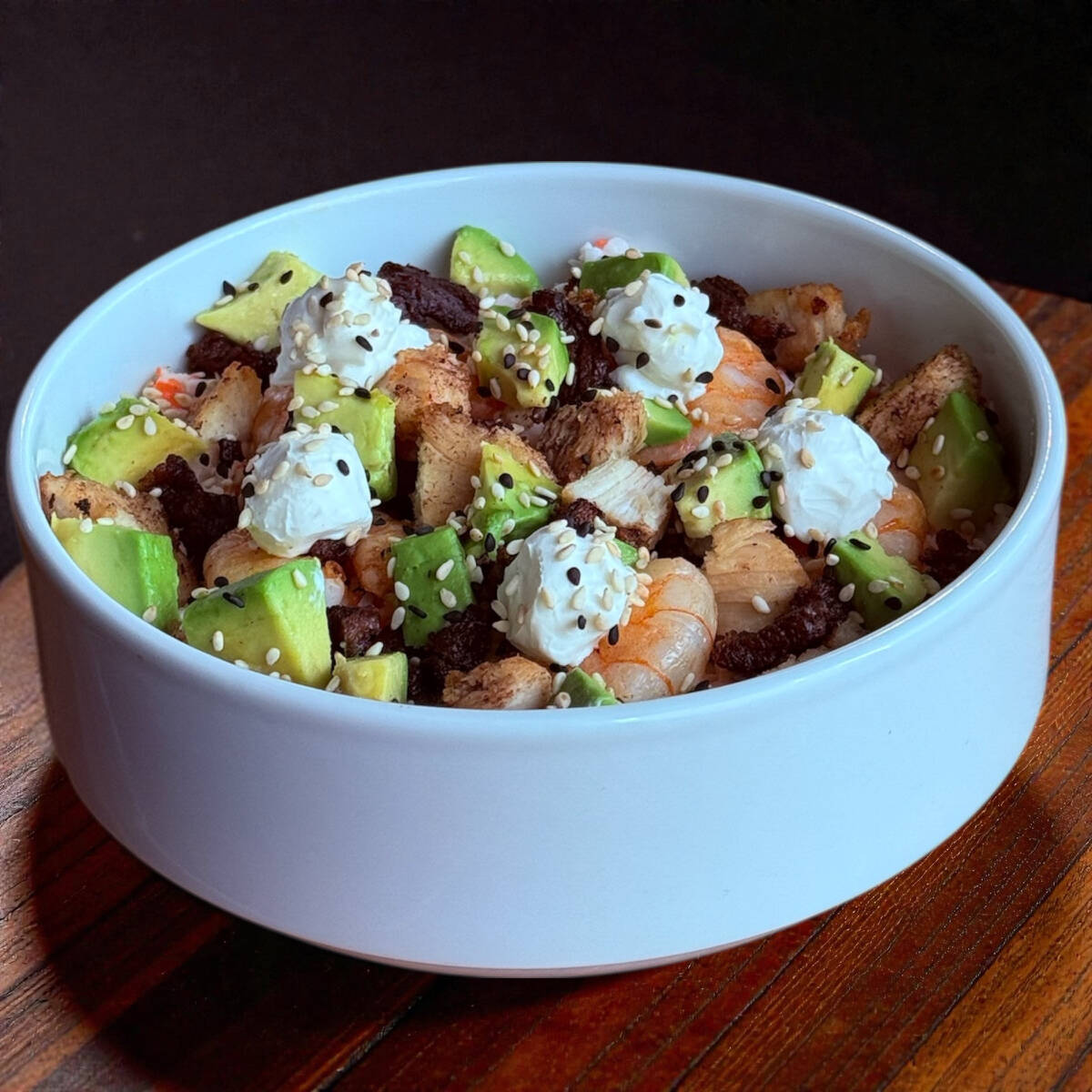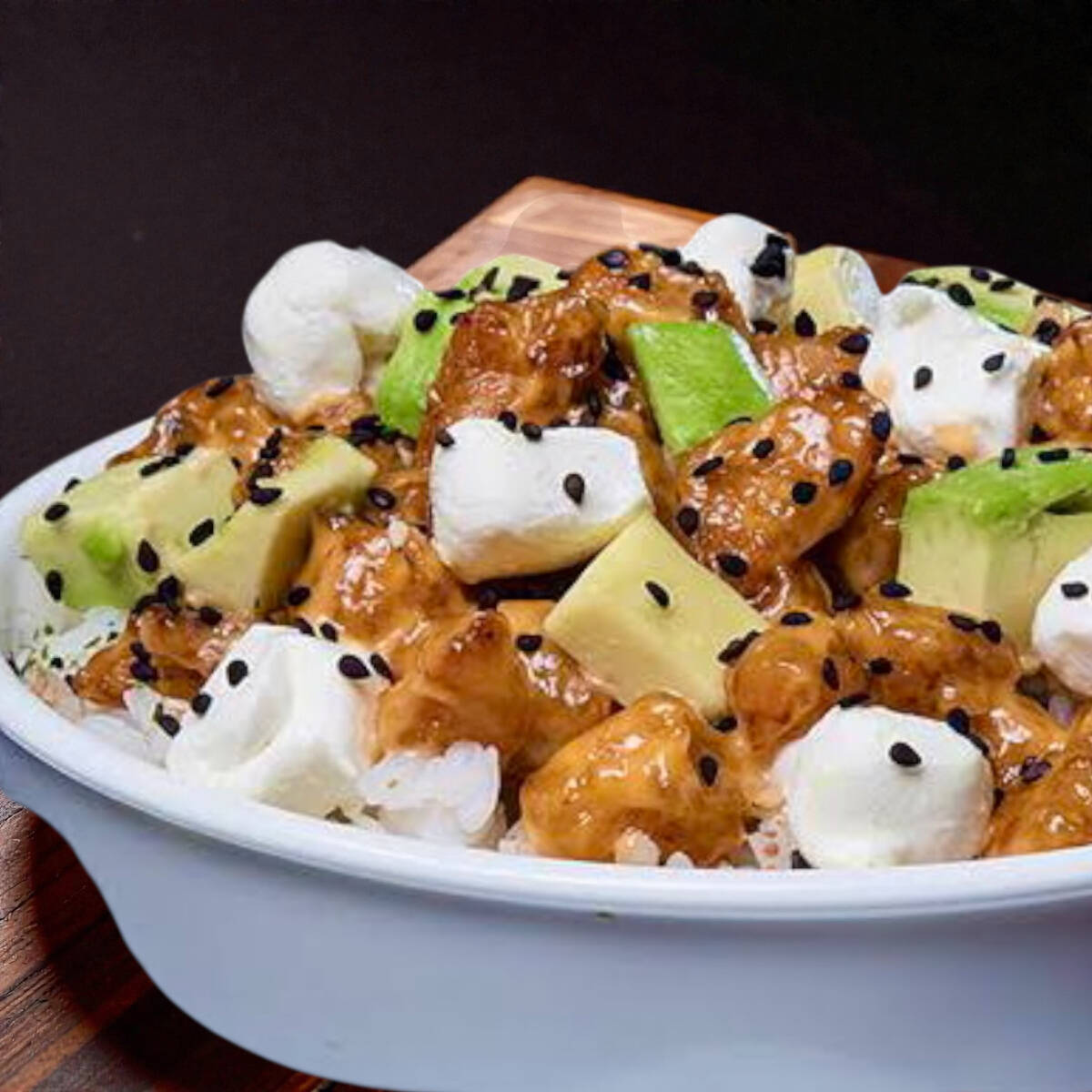 Base de arroz blanco al vapor. Servido con tampico. Coronado con un mix de res, pollo y camarones fritos, philadelphia y cubitos de aguacate.