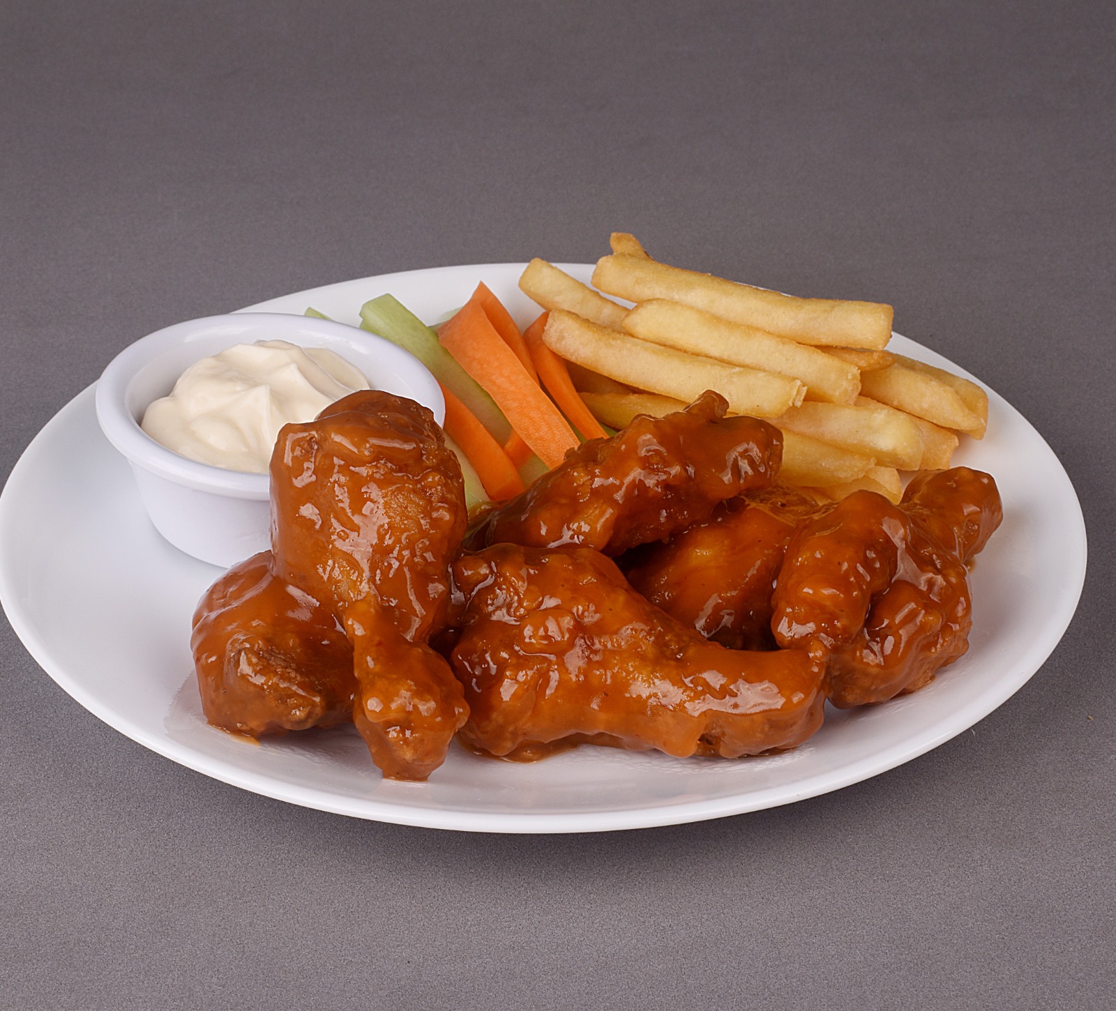Alitas bañadas en la salsa que tu elijas, acompañadas con tiras de zanahoria, pepinos, papas a la francesa y aderezo ranch.