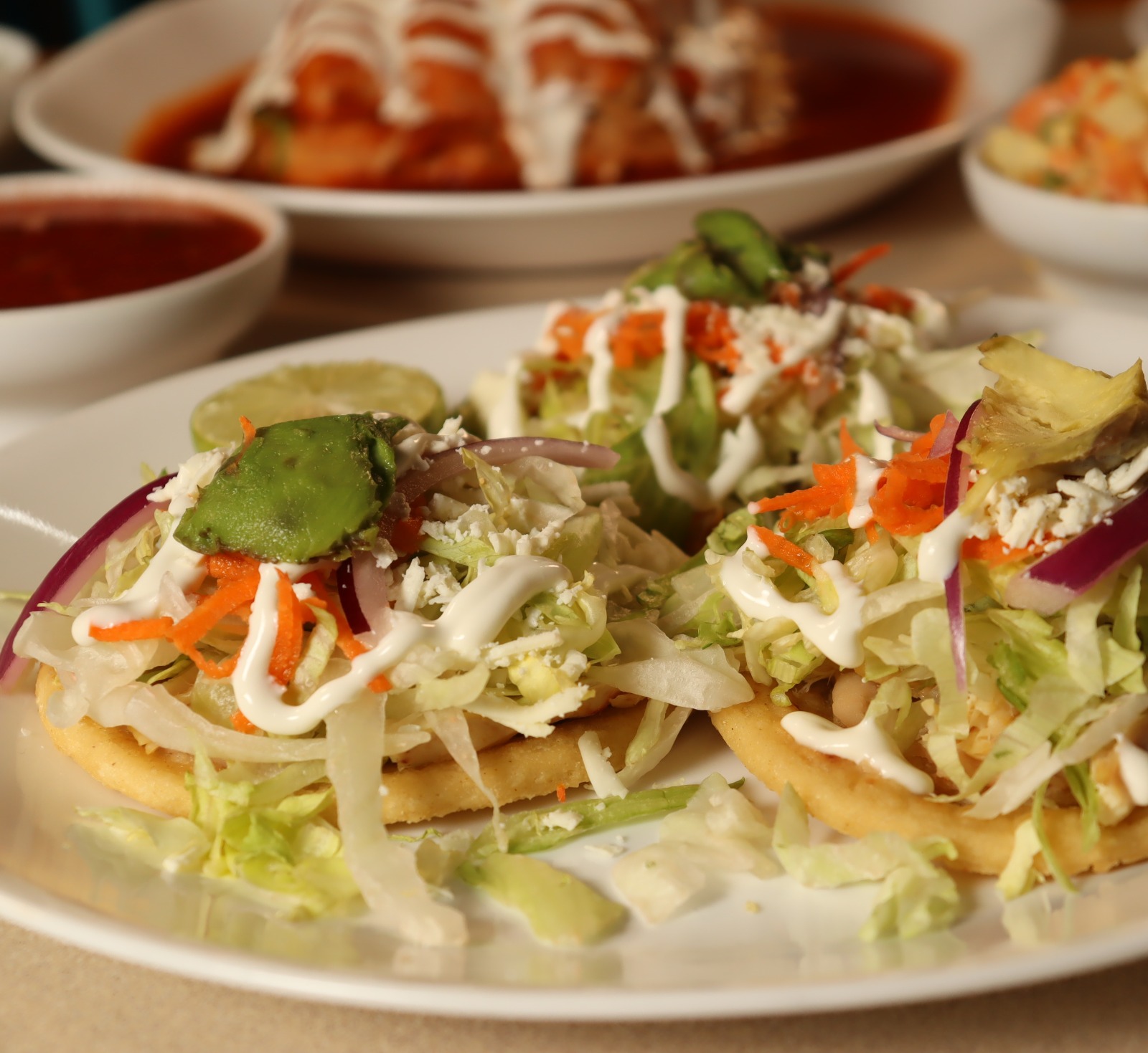 3 gorditas de pollo servidas con verdura, crema, queso y caldo sazonado