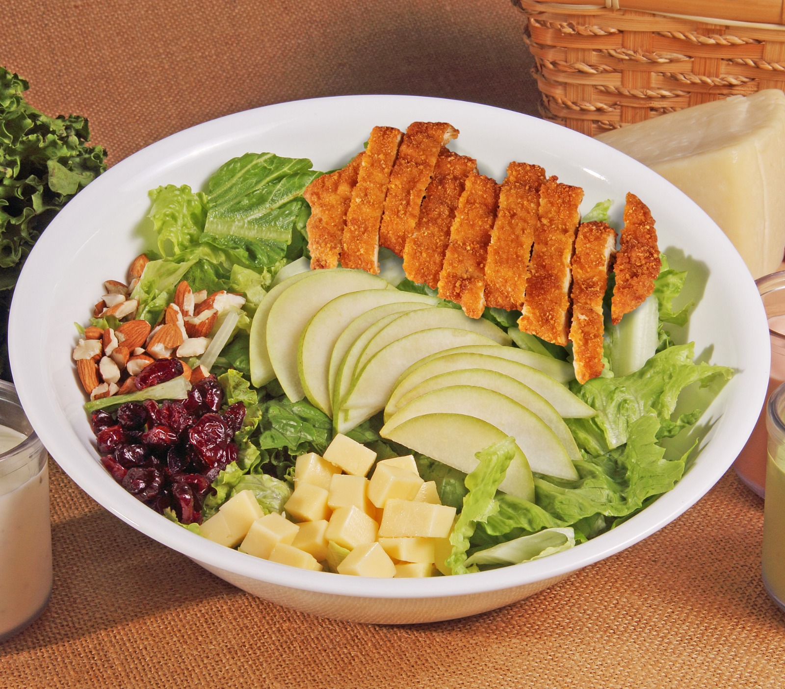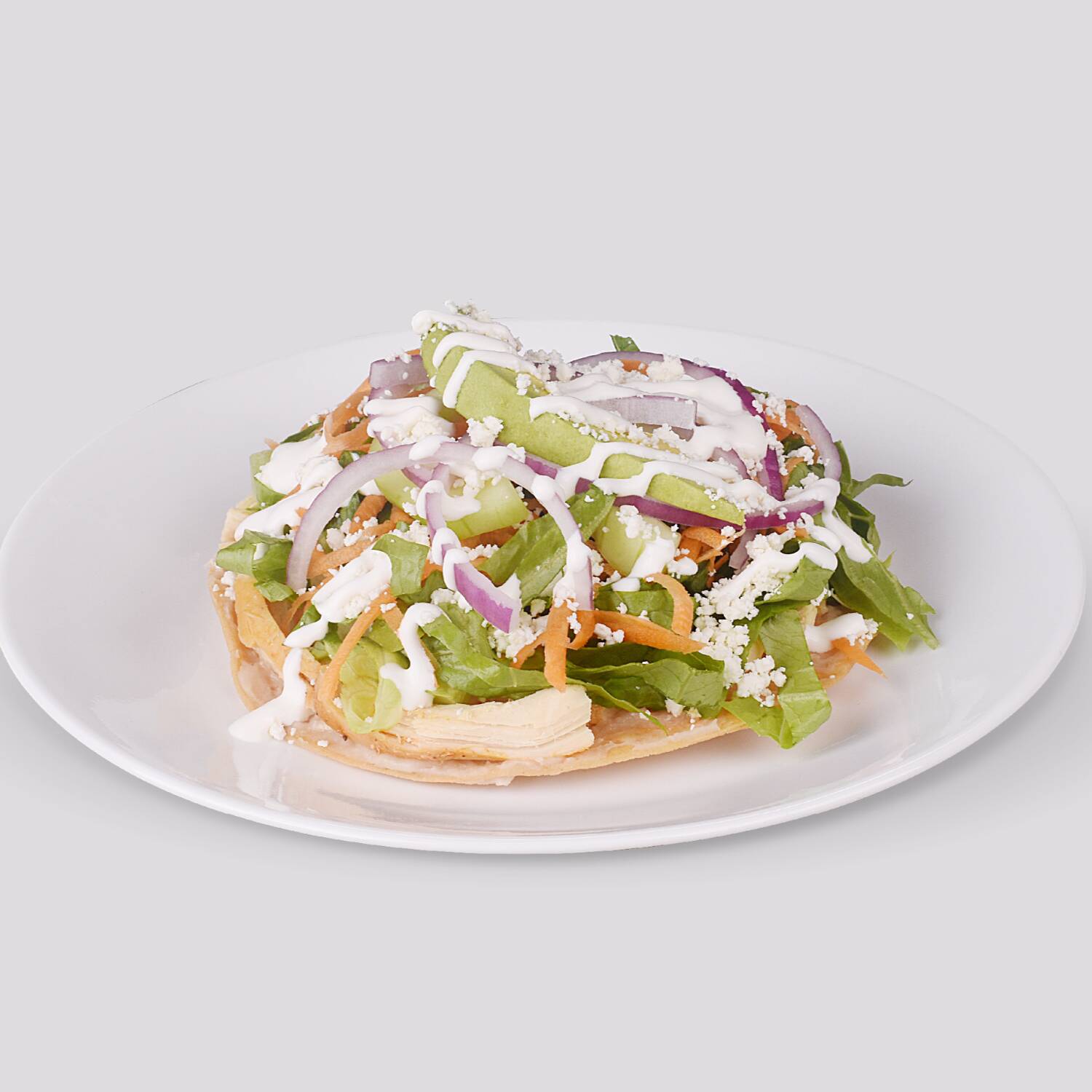 Mezcla de lechuga, pepino, cebolla morada, zanahoria, queso chihuahua, totopos, y pollo.