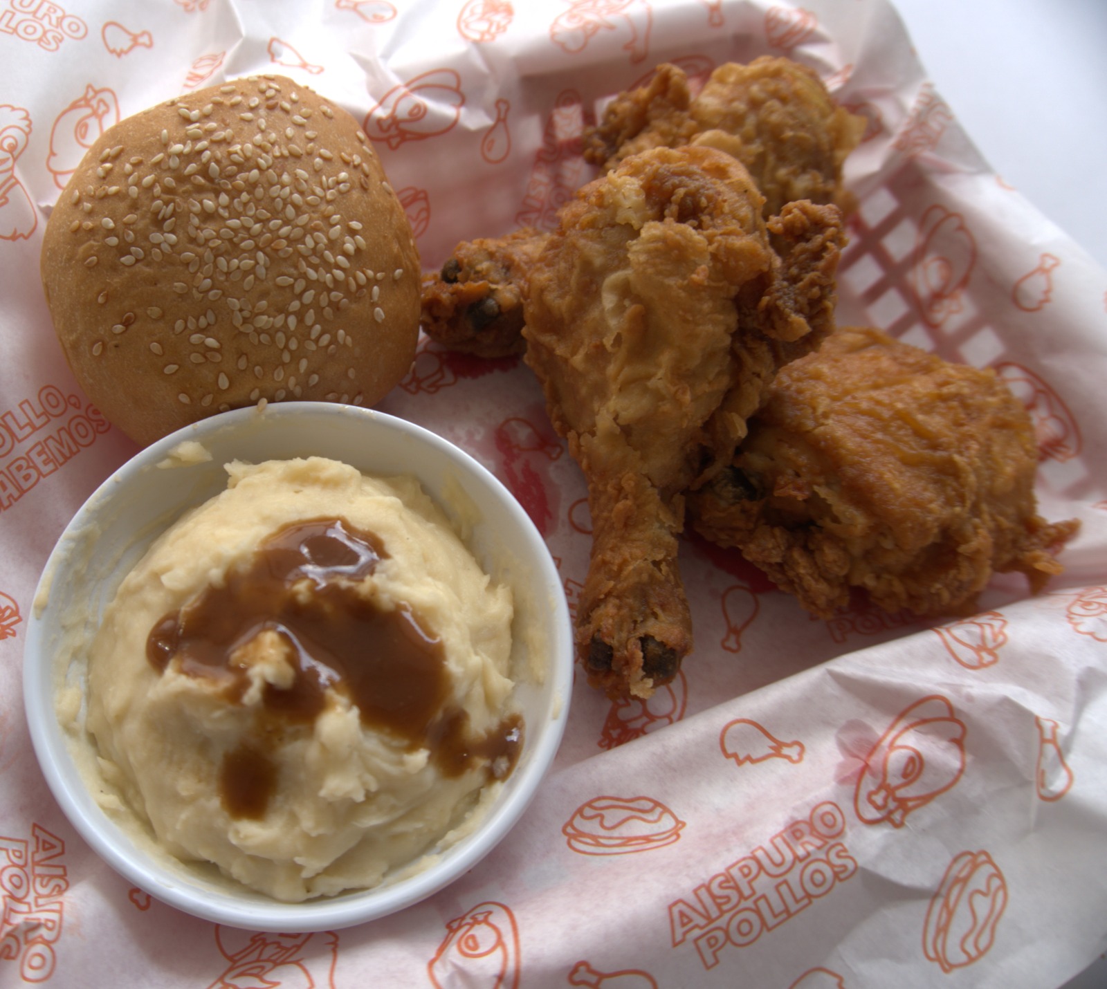 Pollo empanizado, acompañado de puré o ensalada de papa, pan, salsa y tortillas.
