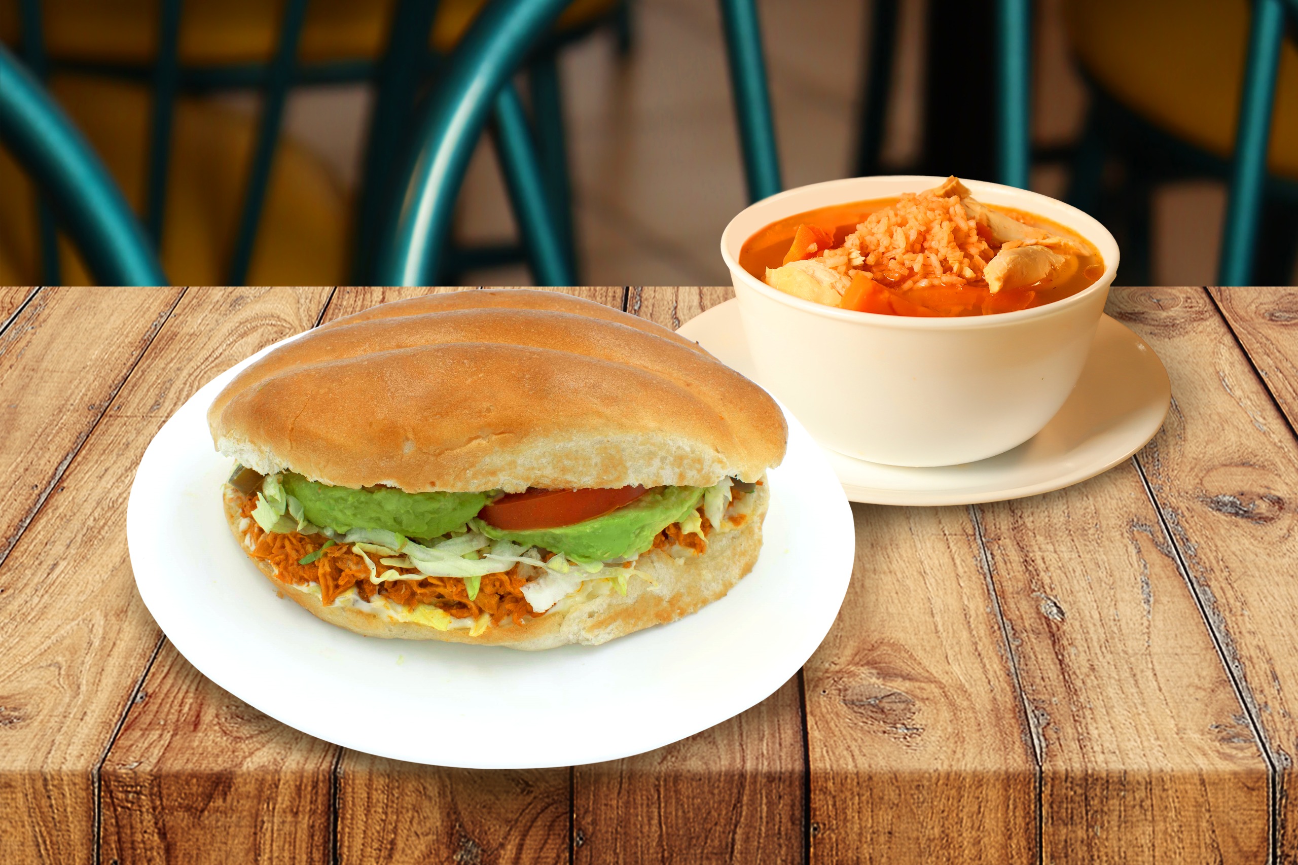 Consome de pollo de 750 ml Servido con arroz, zanahoria, acompañado de limón, cebolla, cilantro, chile, y tortillas. Mas torta de cochinita Servida con verdura fresca, aguacate, y chile jalapeño.
