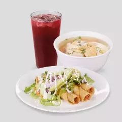 1 consomé chico y 3 tacos dorados con su verdura y caldito, más 1 bebida de 600ml.