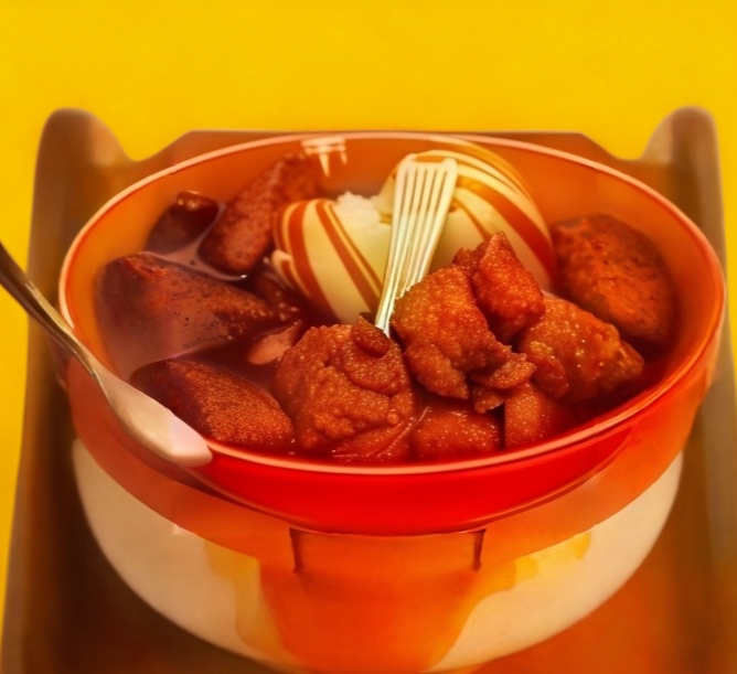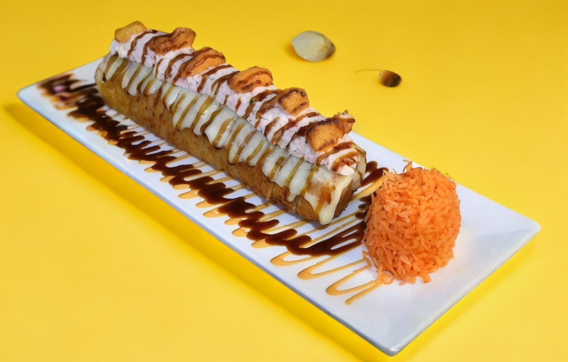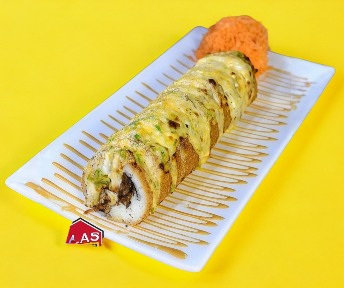 Rollo empanizado relleno de res, pepino, aguacate, philadelphia. Forrado de queso tipo chester gratinado. Coronado con tampico y camarón sobre un espejo de aderezo spicy. Decorado con salsa de anguila.