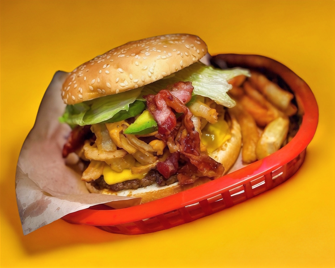 Carne molida de res especial, queso amarillo, cebolla crujiente, tocino, aguacate, lechuga, aderezo chipotle.