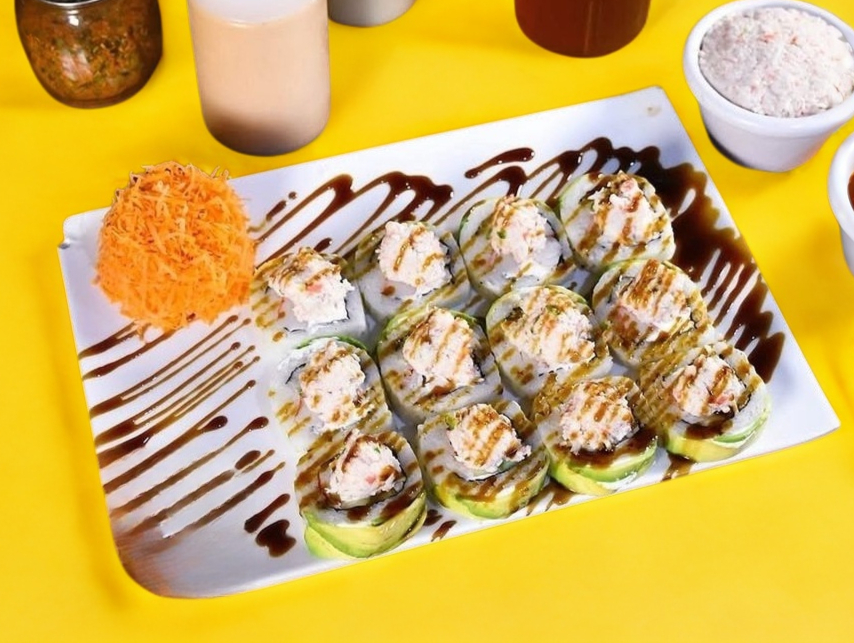 Rollo empanizado, relleno de aguacate, philadelphia, pepino, camaron tempura. Coronado con pasta spicy de tocino. Decorado con salsa de anguila.
