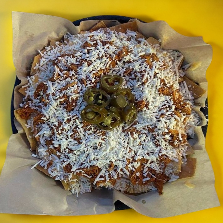Totopos de maíz, con frijol, queso amarillo, queso espolvoreado, chiles jalapeños y cochinita pibil a elegir