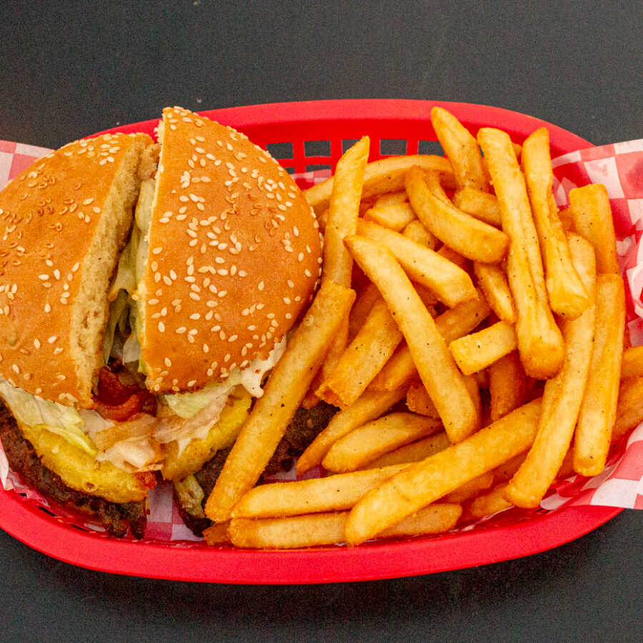 Carne molida de res especial, piña asada, salsa bbq, queso mozzarella, tocino, lechuga, cebolla caramelizada.