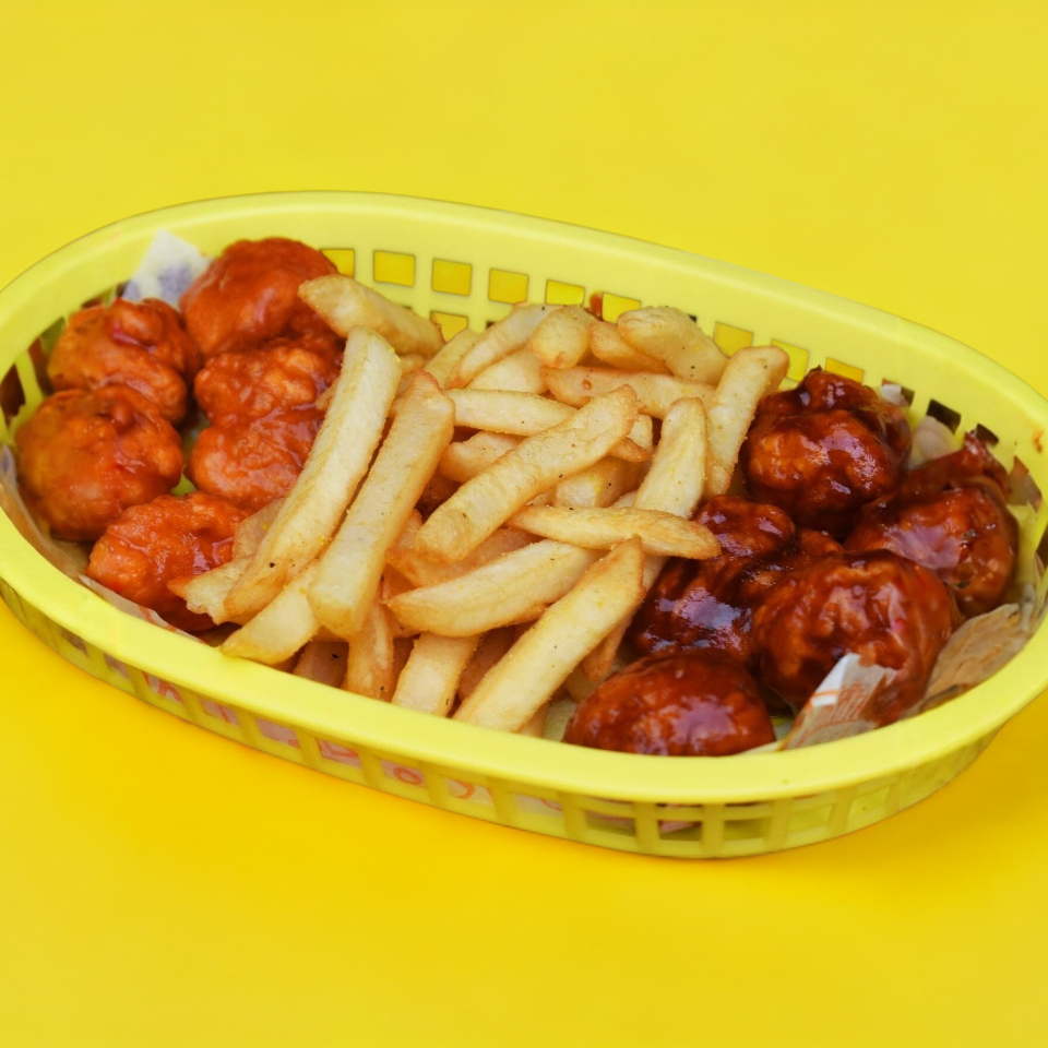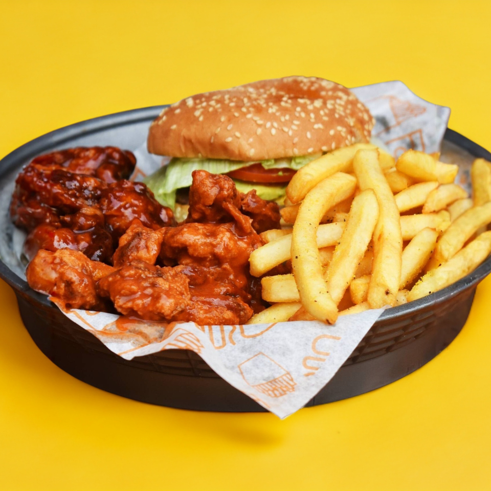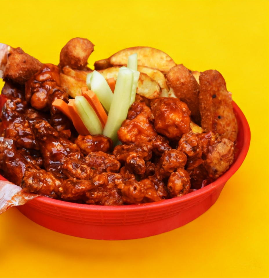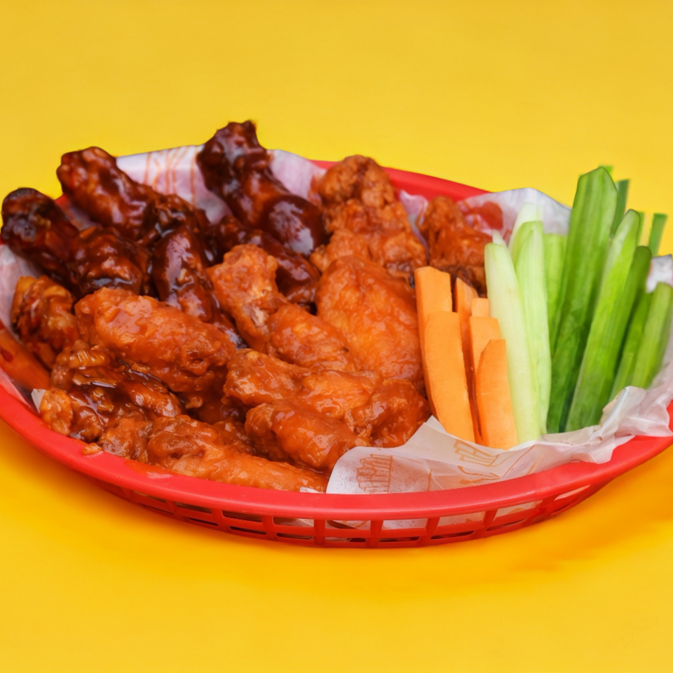 10 Alitas + 10 pz de boneless + dedos de queso + papas sazonadas + vegetales.