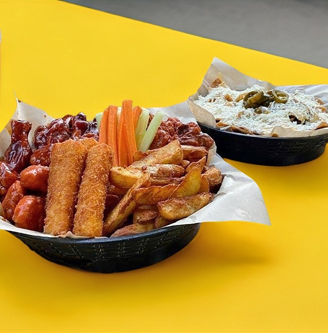 20 Alitas + 12 pz de boneless + papas sazonadas + dedos de queso + nachos + vegetales.