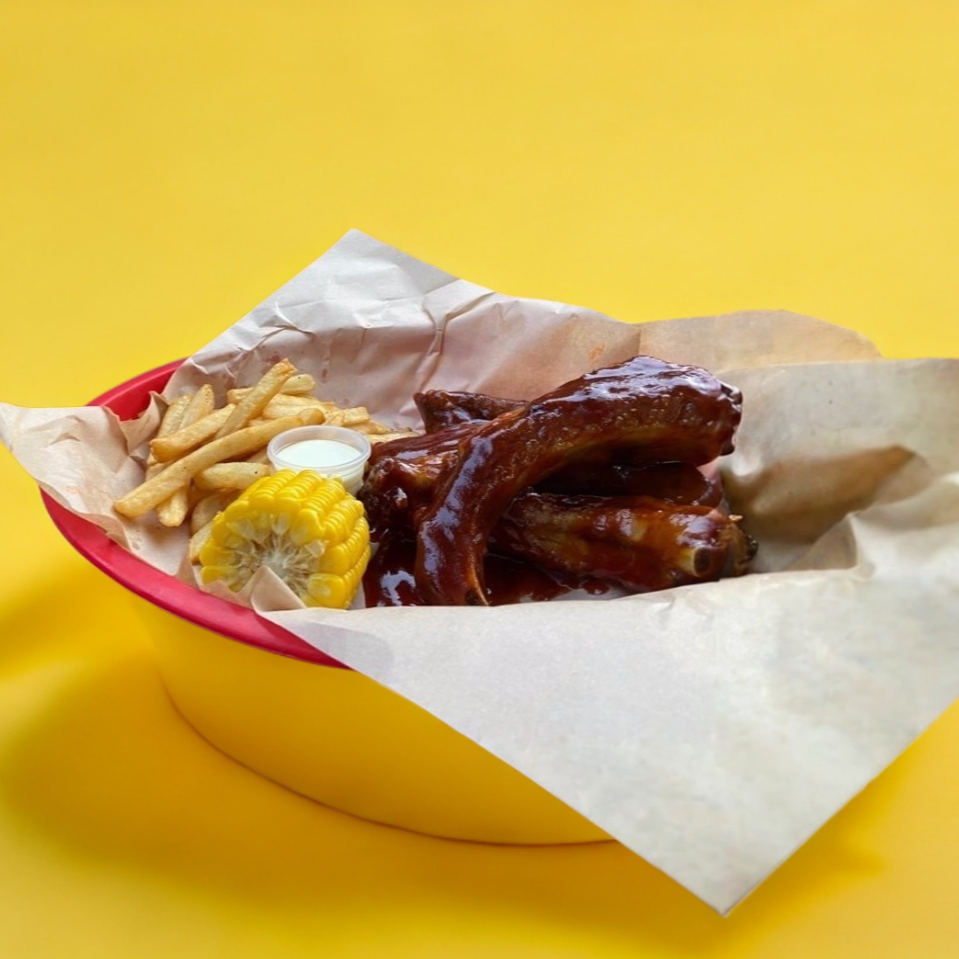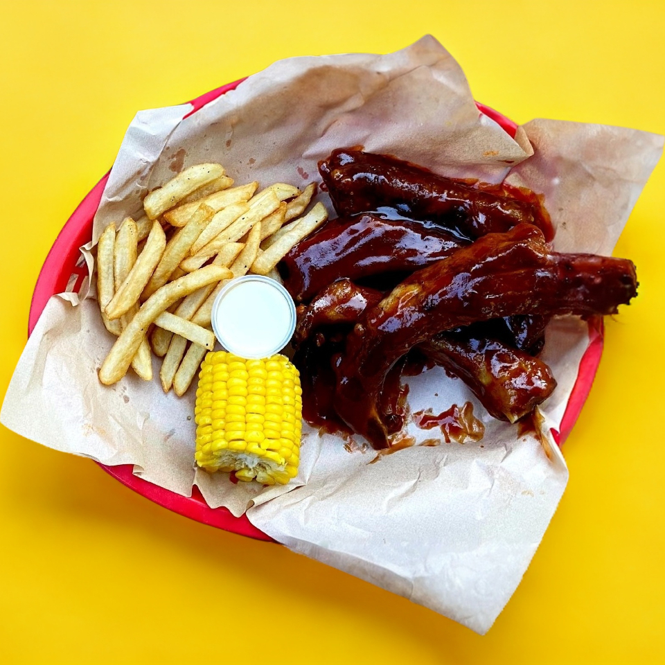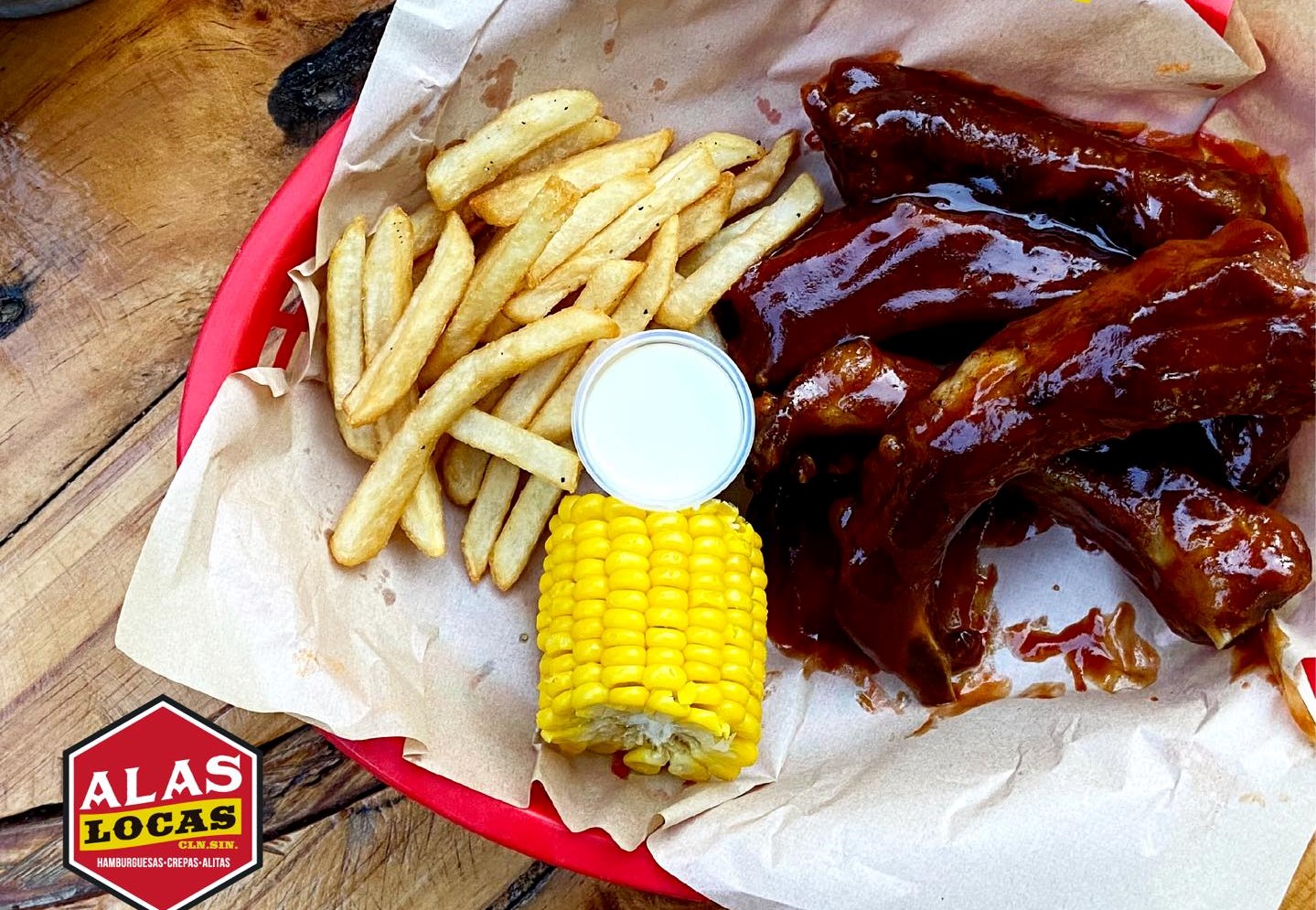 300 gr de costilla antes de cocinar. Acompañada de papas francesas 100 gr y una pieza de elote dulce.