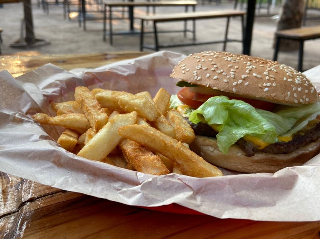Carne molida de res especial, piña asada, salsa bbq, queso mozzarella, tocino, lechuga, cebolla caramelizada.