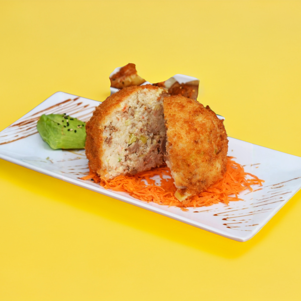 Rollo empanizado relleno de camarón, res, philadelphia, pepino y aguacate.