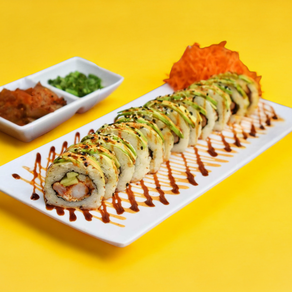 Rollo natural, relleno de pepeino, philadephia, camarón capeado. Forrado con aguacate. Decorado con salsa spicy y salsa de anguila.
