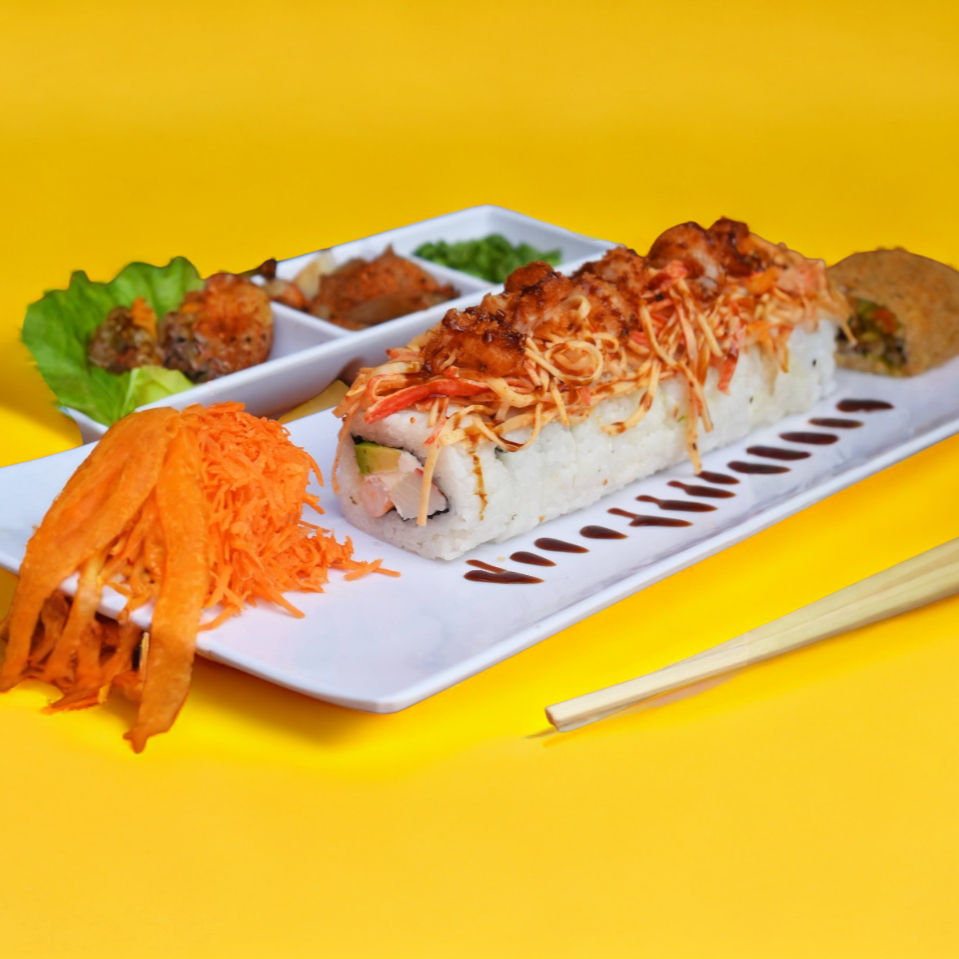 Rollo natural relleno de surimi, camarón, pepino, aguacate y philadelphia. Coronado con camarón maripoza sobre una cama de kanikama spicy. Decorado con salsa de anguila y ajonjoli.
