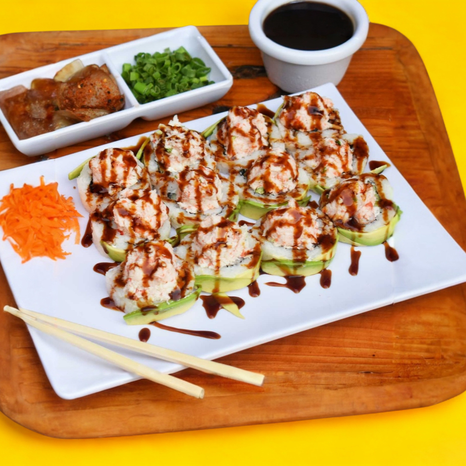 Rollo natural relleno de cangrejo, camarón, pepino y philadelphia. Forrado de aguacate. Coronado con tampico. Decorado con salsa de anguila.