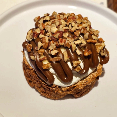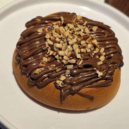 Rollo empanizado, relleno de aguacate, philadelphia, pepino, camaron tempura. Coronado con pasta spicy de tocino. Decorado con salsa de anguila.