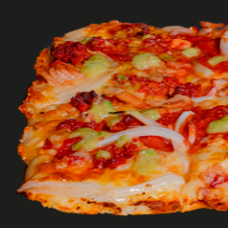 Chorizo, Tocino, Cebolla y pesto de jalapeños. Pizza cuadrada 20X35CM en 8 rebanadas.