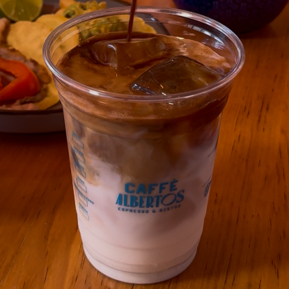 Espresso, jarabe de chocolate, hielos y leche. Tamaño Gde 16oz.