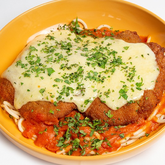 Pechugas empanizada 200 g con salsa pomodoro importada de italia, queso mozzarella gratinado y spaghetti.