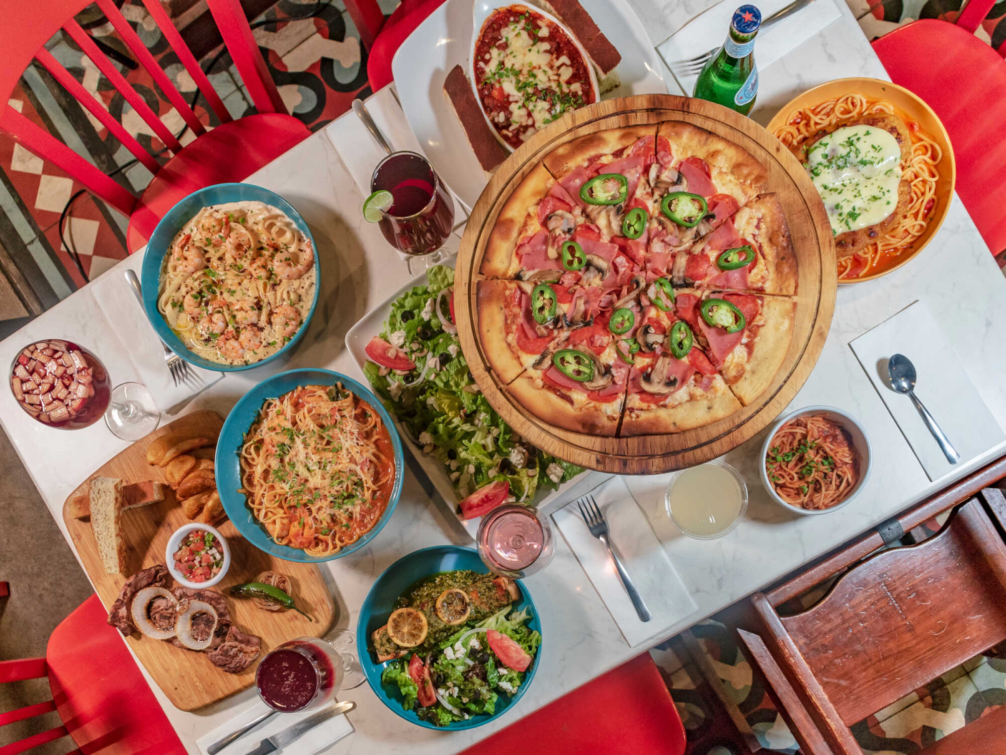Spaghetti al pesto, fetuccini alfredo y spaghetti a la bolognesa.