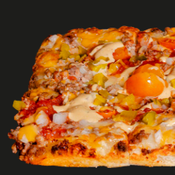 Carne molida, Queso americano, Cebollita, Pepinillos, tomate cherry y aderezo mil islas. Pizza cuadrada 20X35CM en 8 rebanadas.