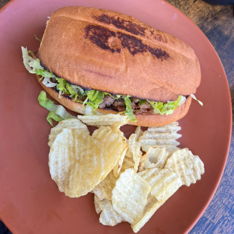 Pan telera dorada con mantequilla, 100 gramos de Carne asada Sirloin, queso fundido, lechuga, tomate, aguacate, cebolla asada y aderezo a elegir. Acompañada de papas fritas y jalapeños.