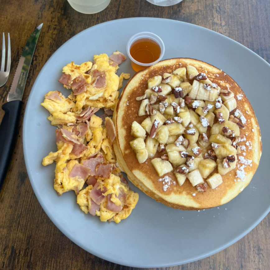 SABROSOS HOT CAKES CON NUEZ, PLATANO Y MIEL ACOMPAÑADOS DE DOS HUEVOS REVUELTOS CON JAMÓN. ACOMPAÑADO DE UN AGUA DE SABOR