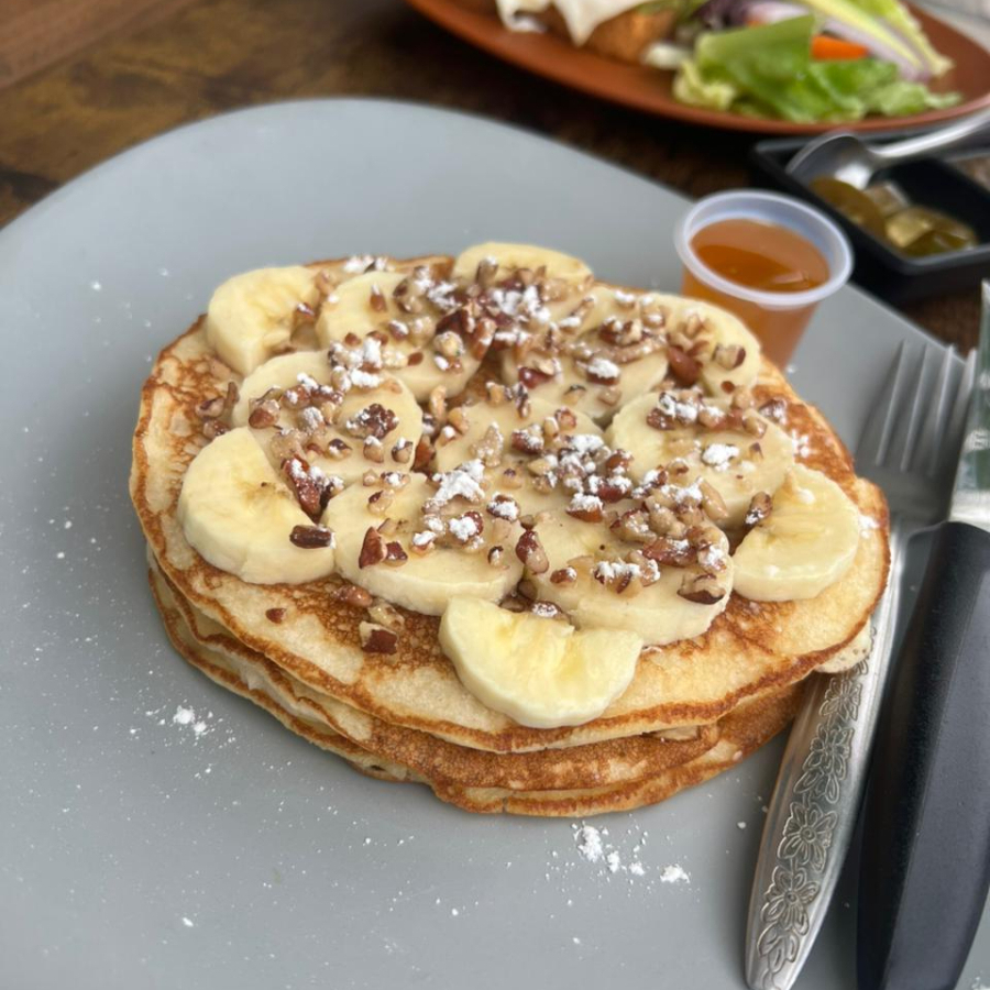 RES PIEZAS DE HOT CAKES ESPONJOSOS, PLÁTANO, NUEZ, MIEL
