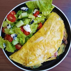 2 PIEZAS DE HUEVO EN OMELLET, QUESO MONTERREY, PORCIÓN DE PROTEÍNA, ACOMPAÑADA DE ENSALADA, TORTILLAS Y SALSA.