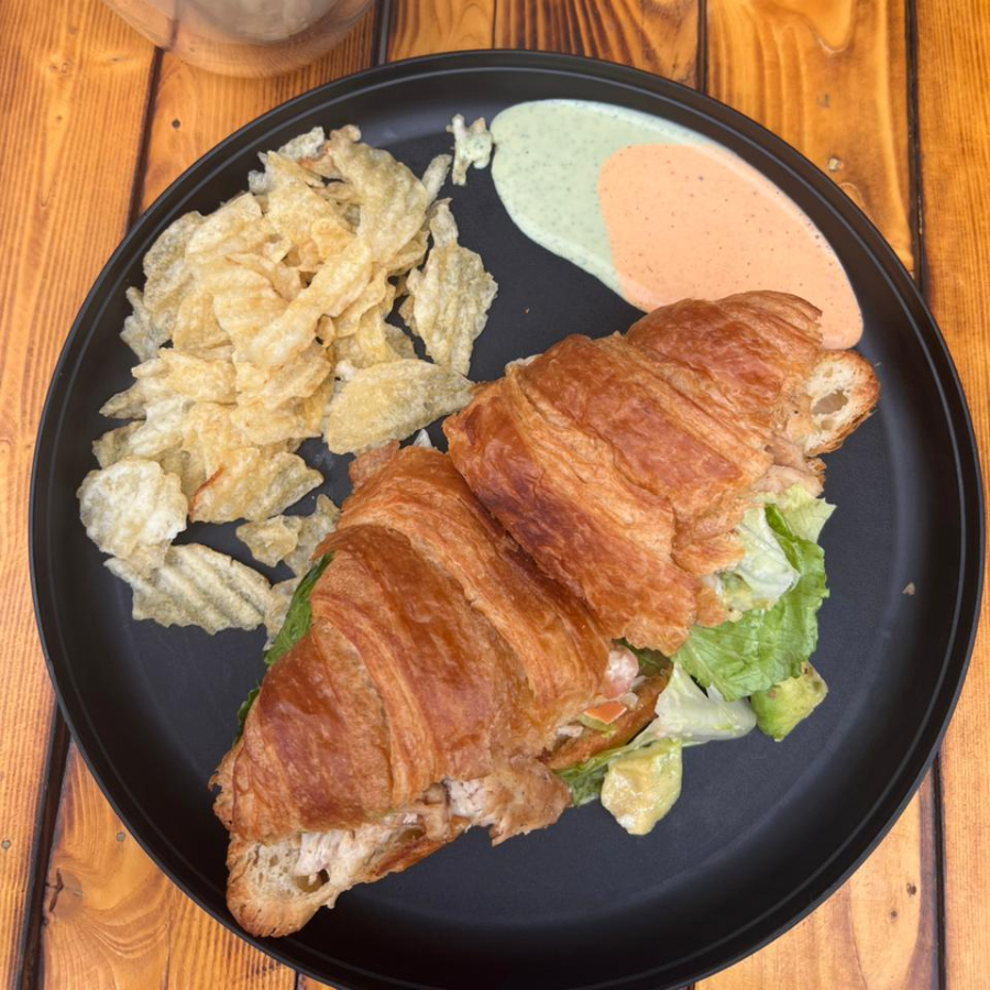 PAN CROISSANT CON MANTEQUILLA, PECHUGA DE POLLO, QUESO AMARILLO, LECHUGA, TOMATE, CEBOLLA, ADERZO DE CILANTRO, ACOMPAÑADO DE PAPAS FRITAS Y JALAPEÑOS