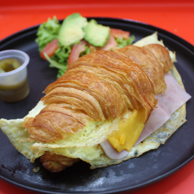 PAN CROISSANT CON MANTEQUILLA, DOS HUEVOS EN OMELLET,JAMON EXTRAFINO, QUESO AMARILLO, LECHUGA, TOMATE, CEBOLLA, ACOMPAÑADO DE MINI ENSALADA.