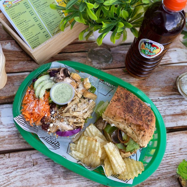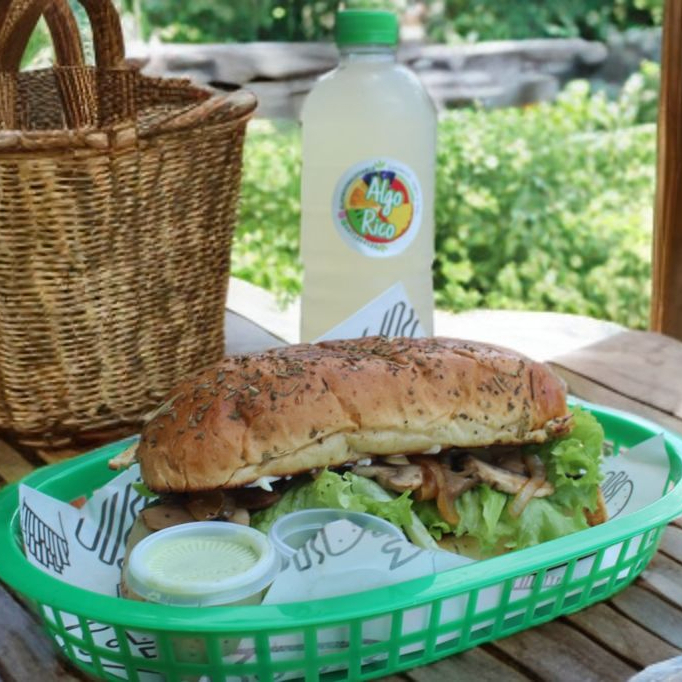 DELICIOSO MEDIO BAGUETTE DE POLLO CON CHAMPIÑONES, LECHUGA, TOMATE, CEBOLLA Y AGUACATE. , MEDIA ENSALADA CON POLLO Y VERDURAS FRESCAS CON ADEREZO DE CILANTRO. ACOMPAÑADO DE PAPAS FRITAS Y UN AGUA DE SABOR.