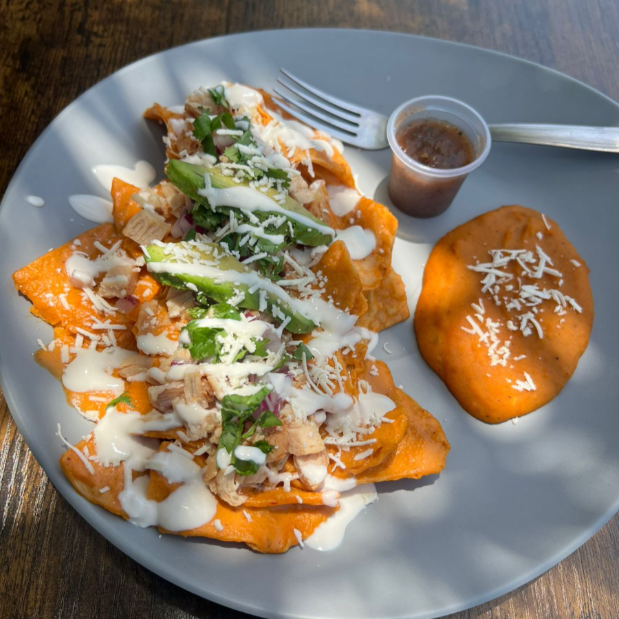 CRUJIENTES TOTOPOS, CREMA SUIZA, CREMA, PECHUGA DE POLLO, QUESO COTIJA, AGUACATE, CILANTRO, CEBOLLA, ACOMPAÑADO DE FRIJOLES Y SALSA.